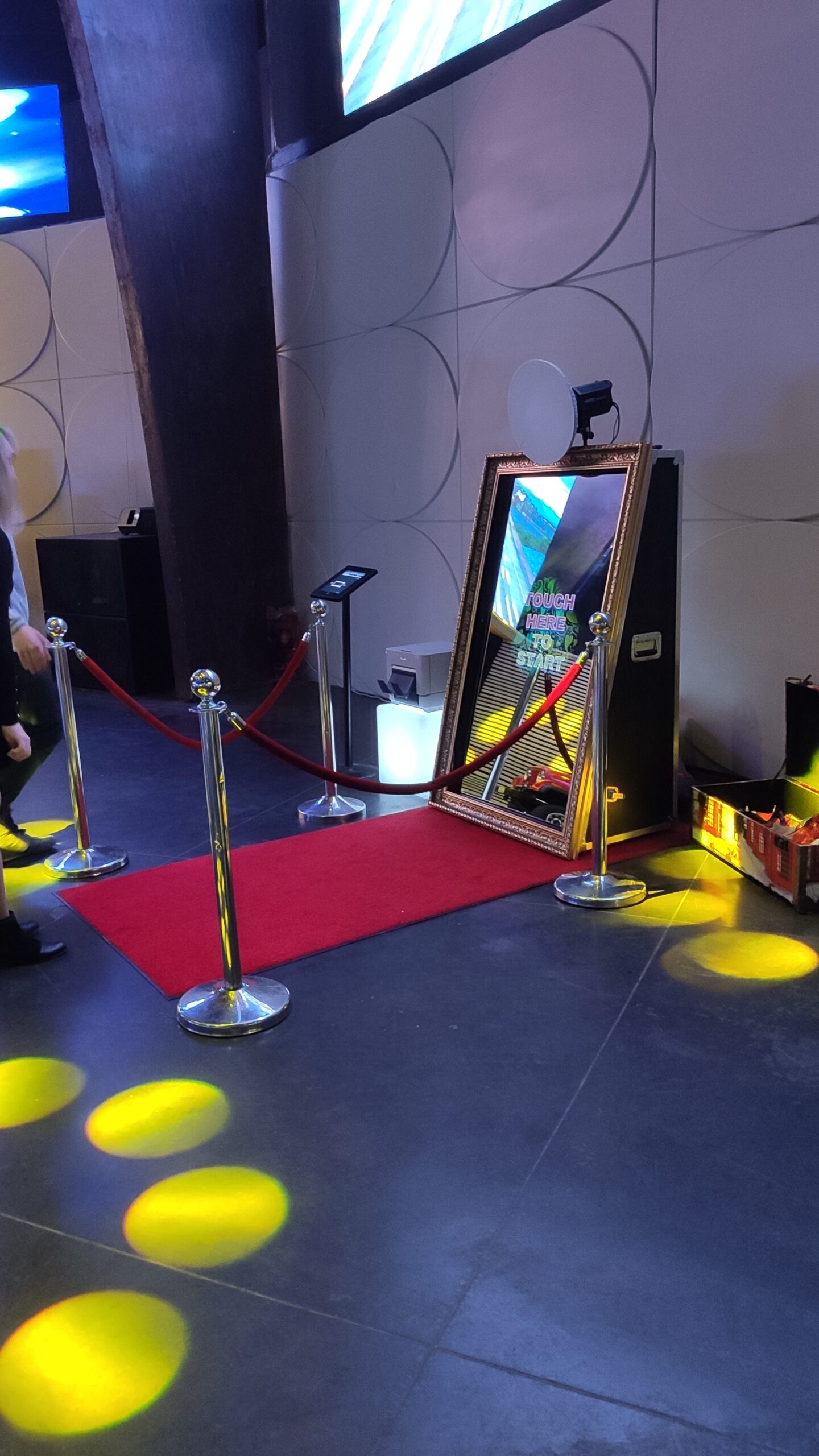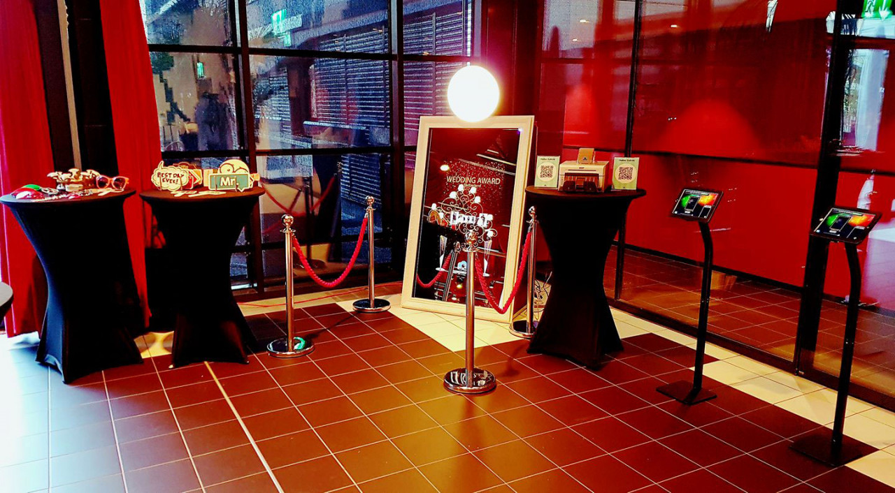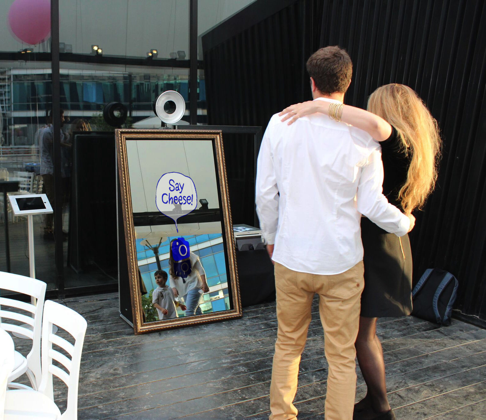 This top-of-the-line photo booth takes the highest quality photos that can be printed out on a custom template that matches your event. You will be able to see your beautiful faces reflecting back on this 5-foot tall mirror. It is equipped with a DSLR camera to ensure everyone looks their best! Every guest will have fun interacting with this touch screen PhotoMirror that provides animations and graphics throughout the experience. All files are saved and given to the event coordinator to keep. The PhotoMirror can also be signed and drawn on with its touchscreen interface.