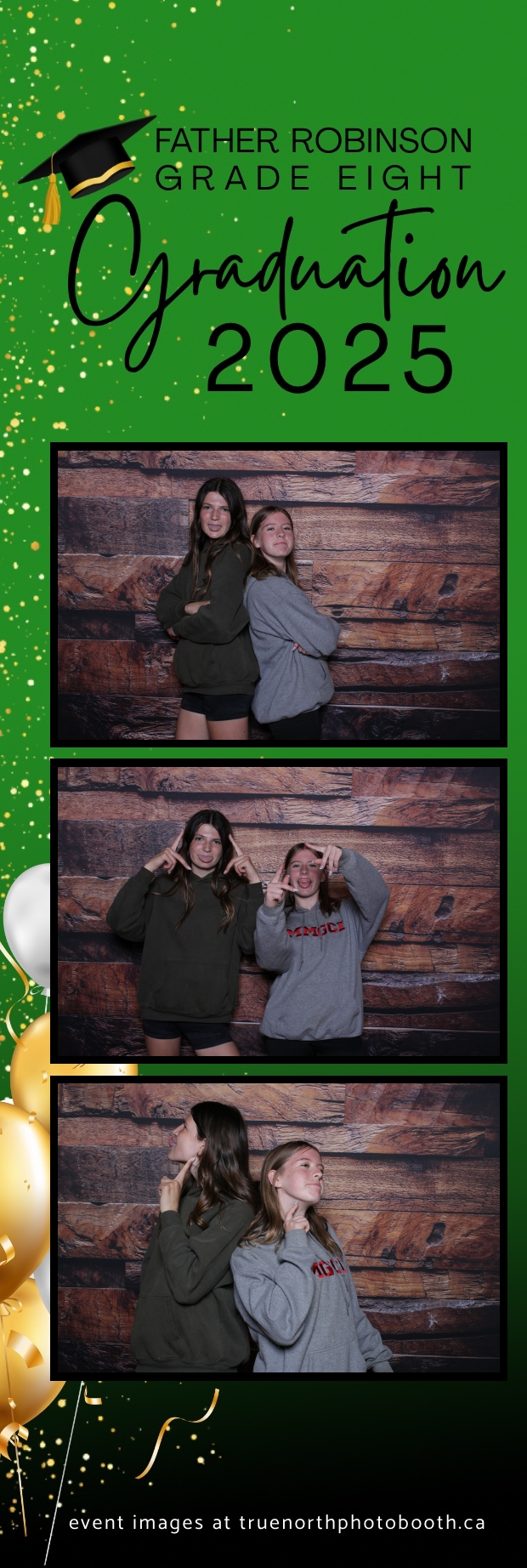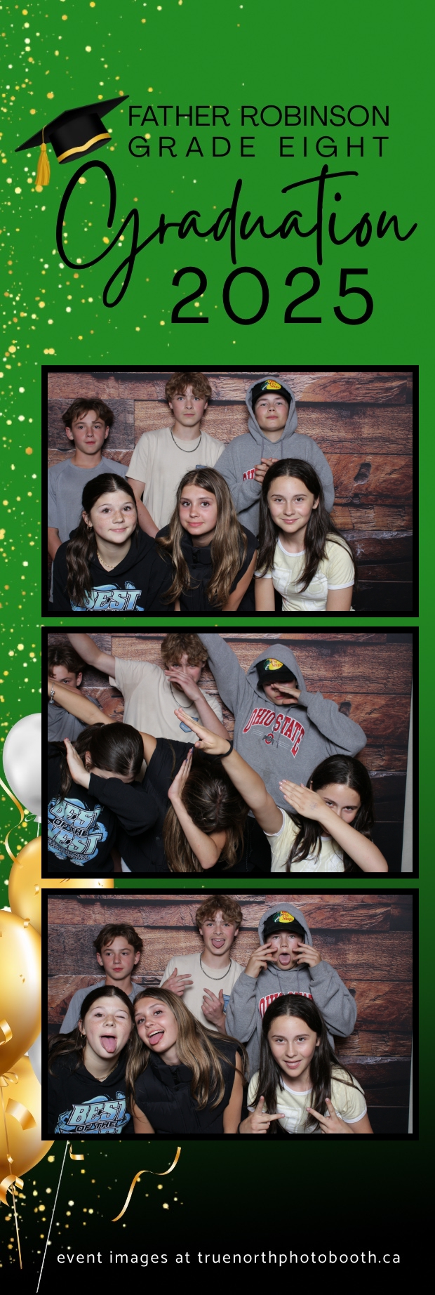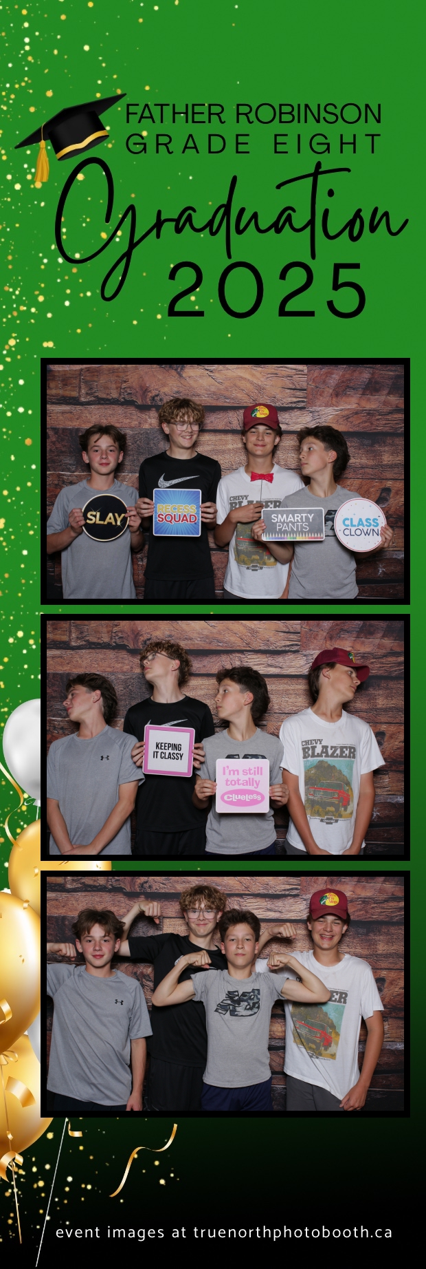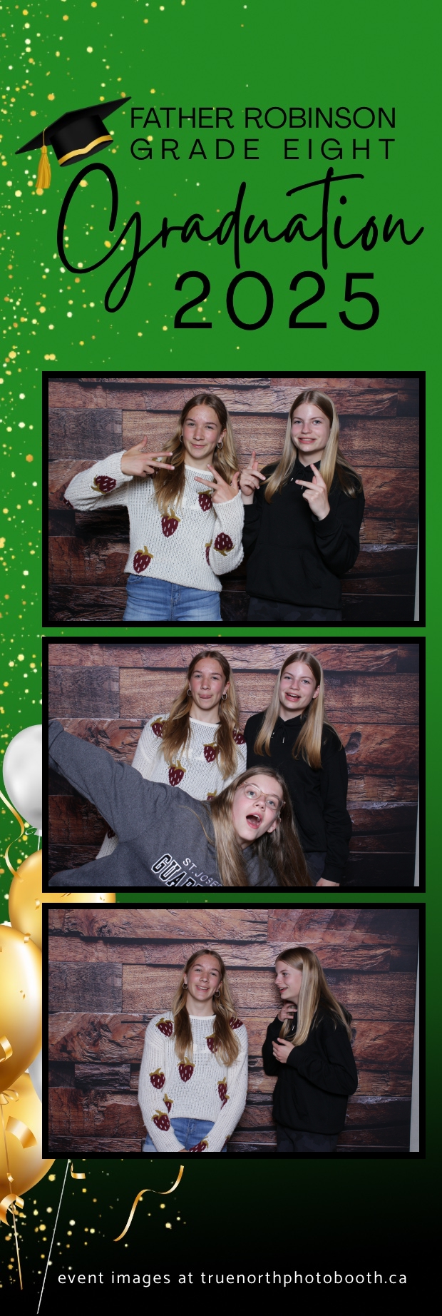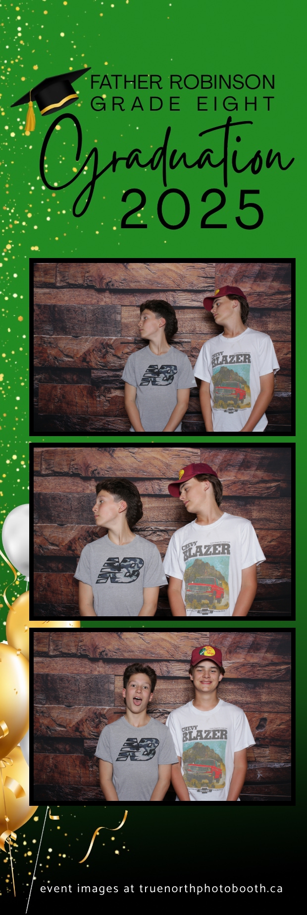 Father Robinson’s Grade 8 Grad 2025 was an unforgettable celebration filled with joy, laughter, and milestone moments—all set against the charming backdrop of Champetre County – Saskatoon Wild West Country Ranch in St-Denis. True North Photo Booth was thrilled to be part of the fun, providing a 2X6 custom photo strip experience that captured every smile and silly pose. The rustic barn board pillow backdrop perfectly matched the venue’s cozy, countryside vibe and added a warm, nostalgic touch to each photo strip.