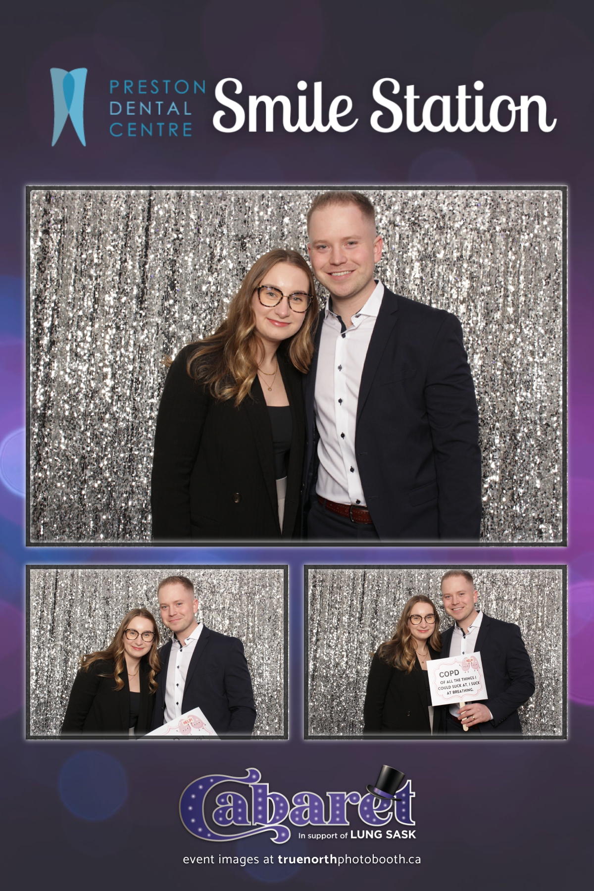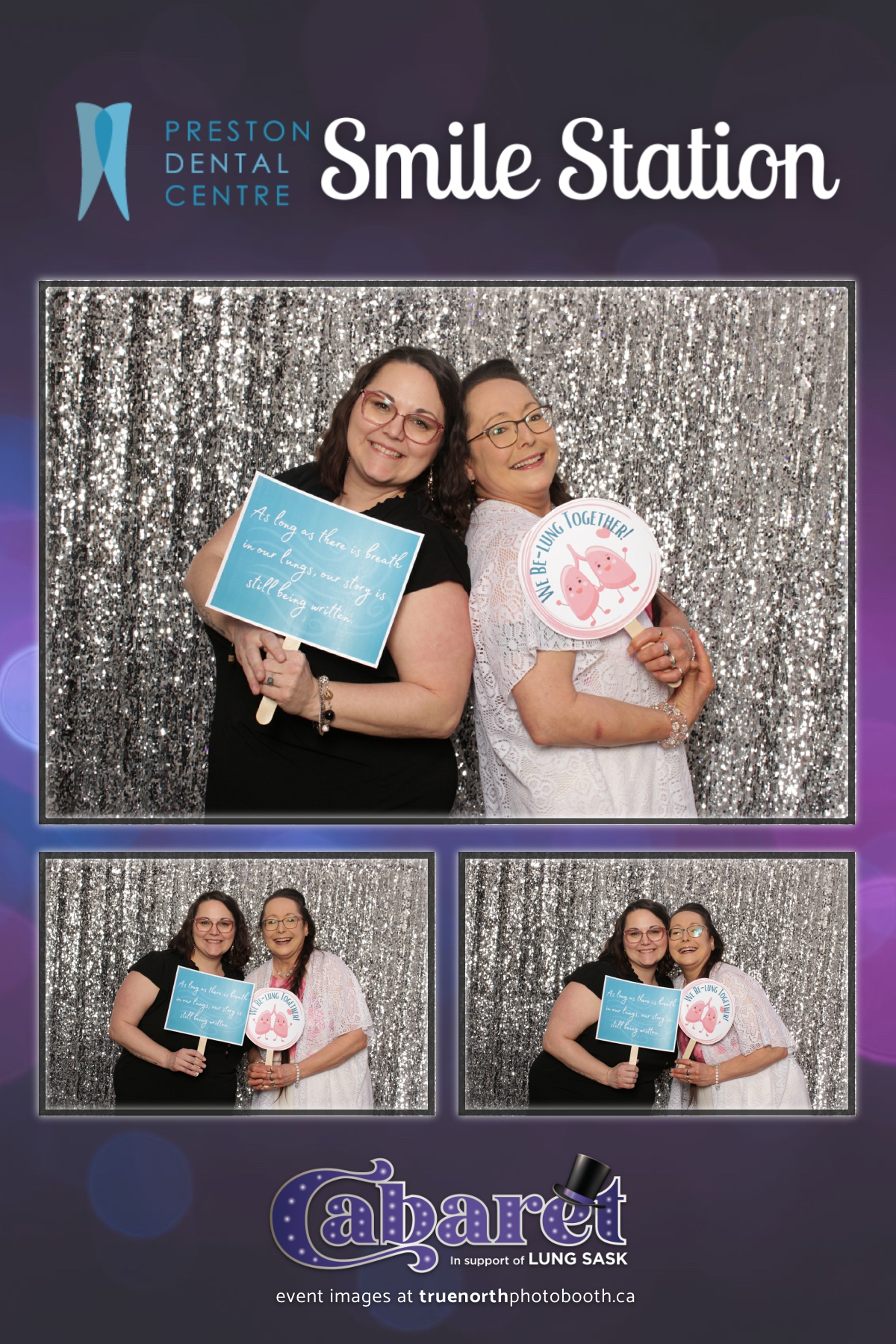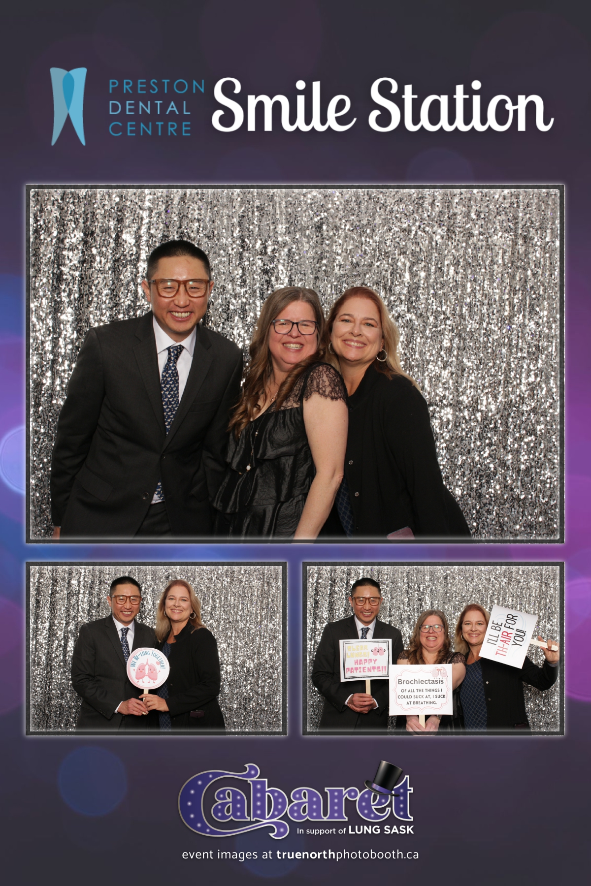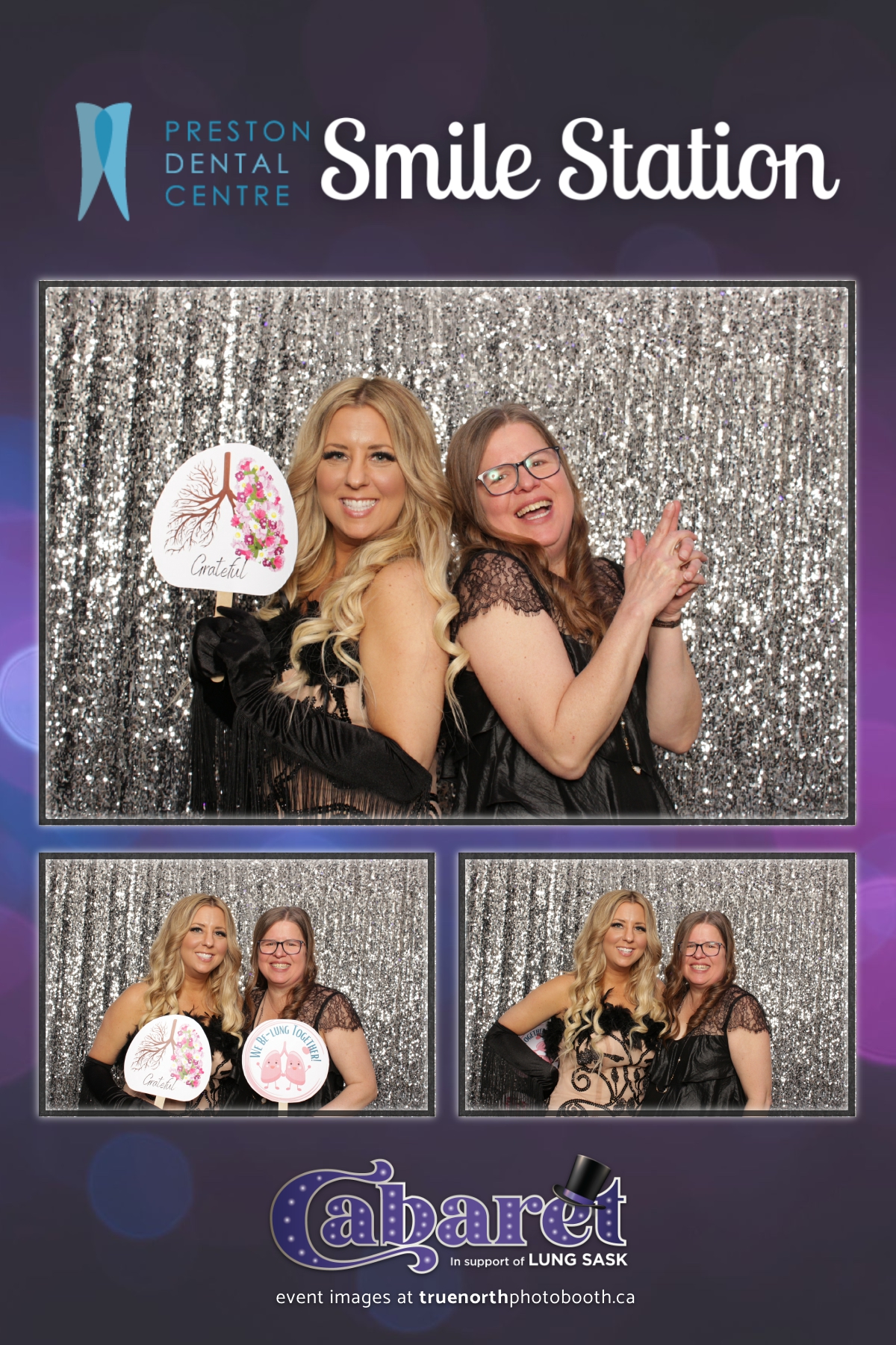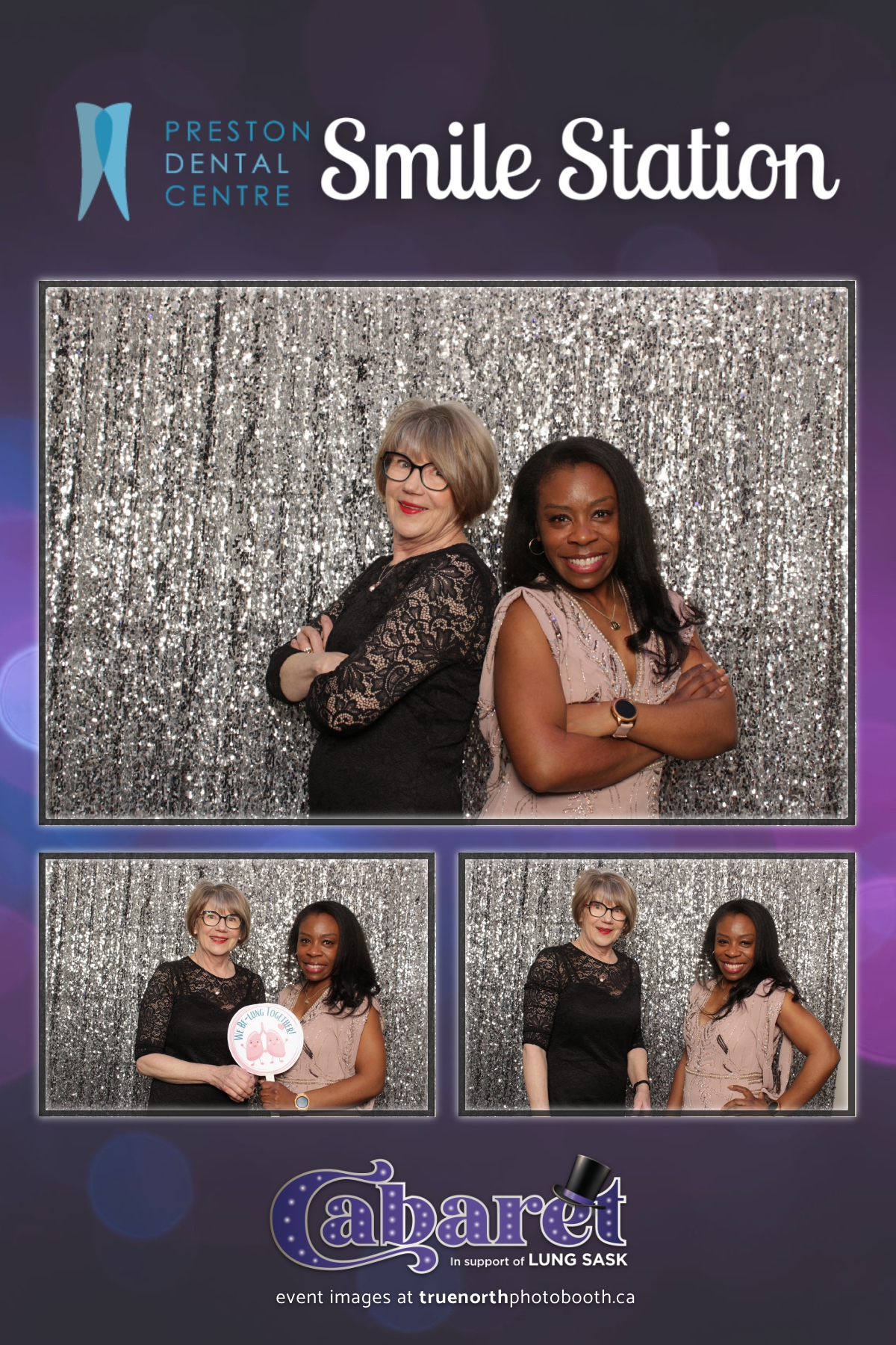 Step into the glitz and glamour of the “Lung Sask Cabaret Smile Station” hosted by Lung Sask at Prairieland Park in Saskatoon. This dazzling event brought together supporters and advocates in a night of laughter, entertainment, and philanthropy. True North Photo Booth was thrilled to be part of the festivities, providing guests with a chance to capture the magic of the evening with custom 4X6 photo strips against a shimmering silver sequin backdrop.