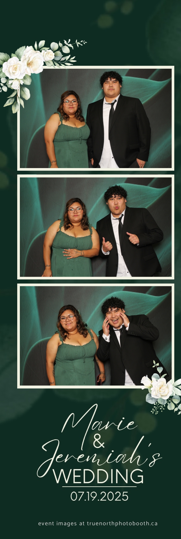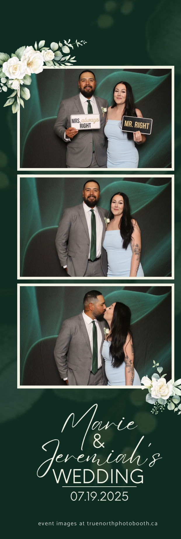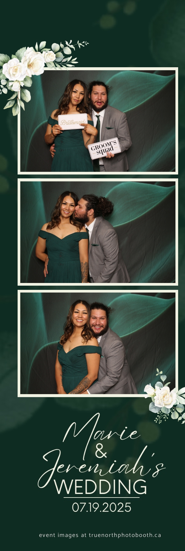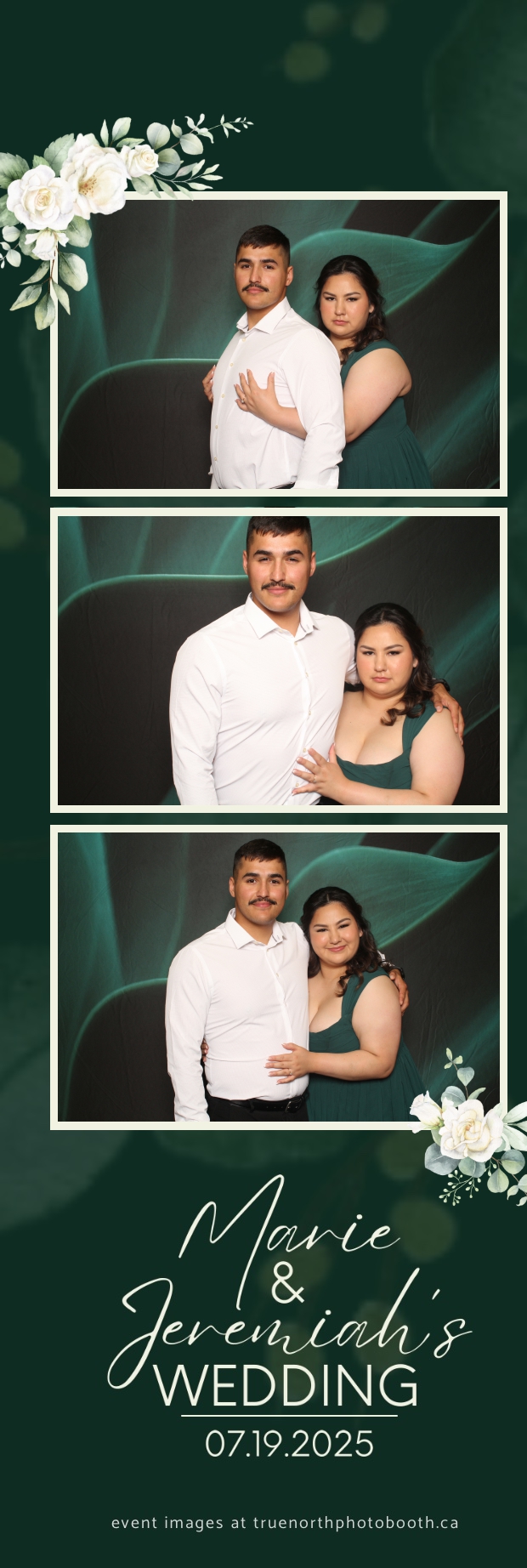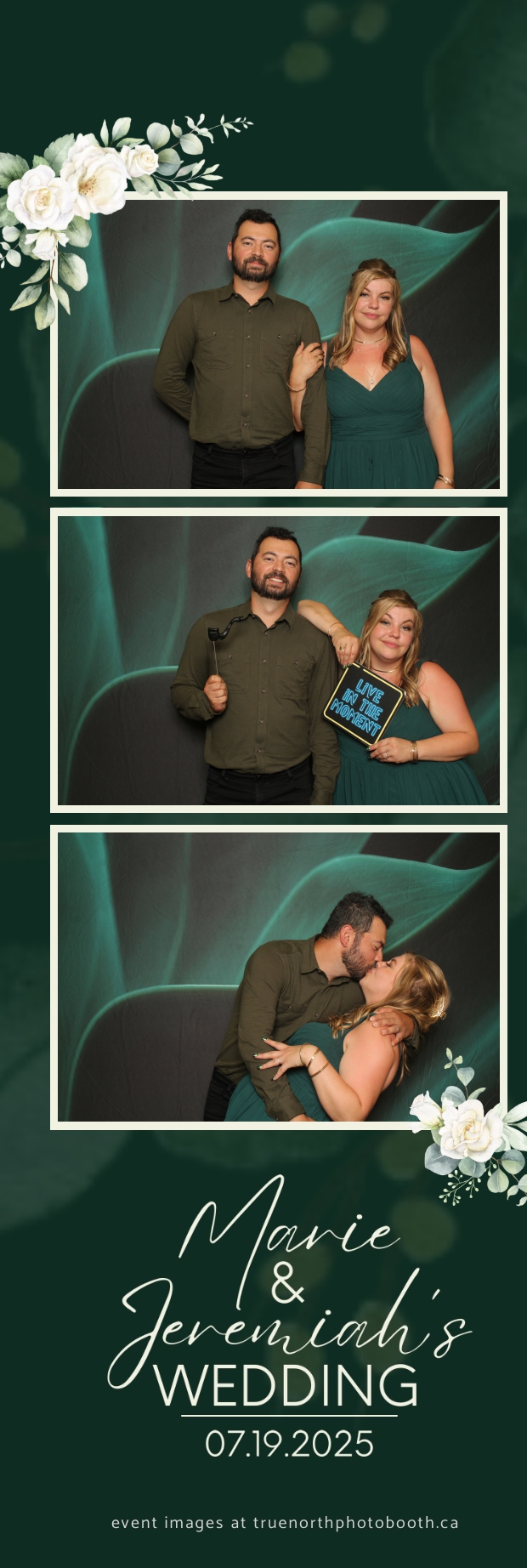 To match the refined atmosphere of the event, our elegant green pillow backdrops provided a lush, sophisticated setting that complemented the couple’s stylish wedding theme. With laughter, love, and countless photo-worthy moments, Marie & Jeremiah’s special day was a picture-perfect celebration made even more memorable with the True North Photo Booth experience.