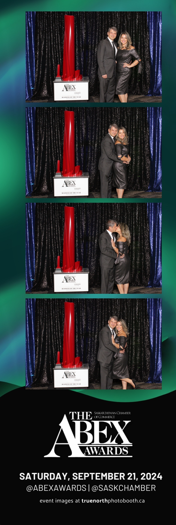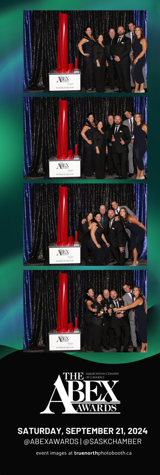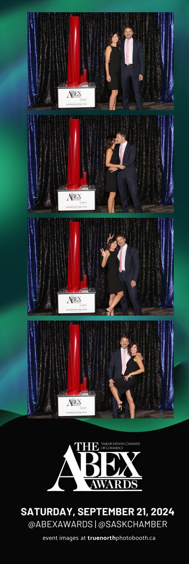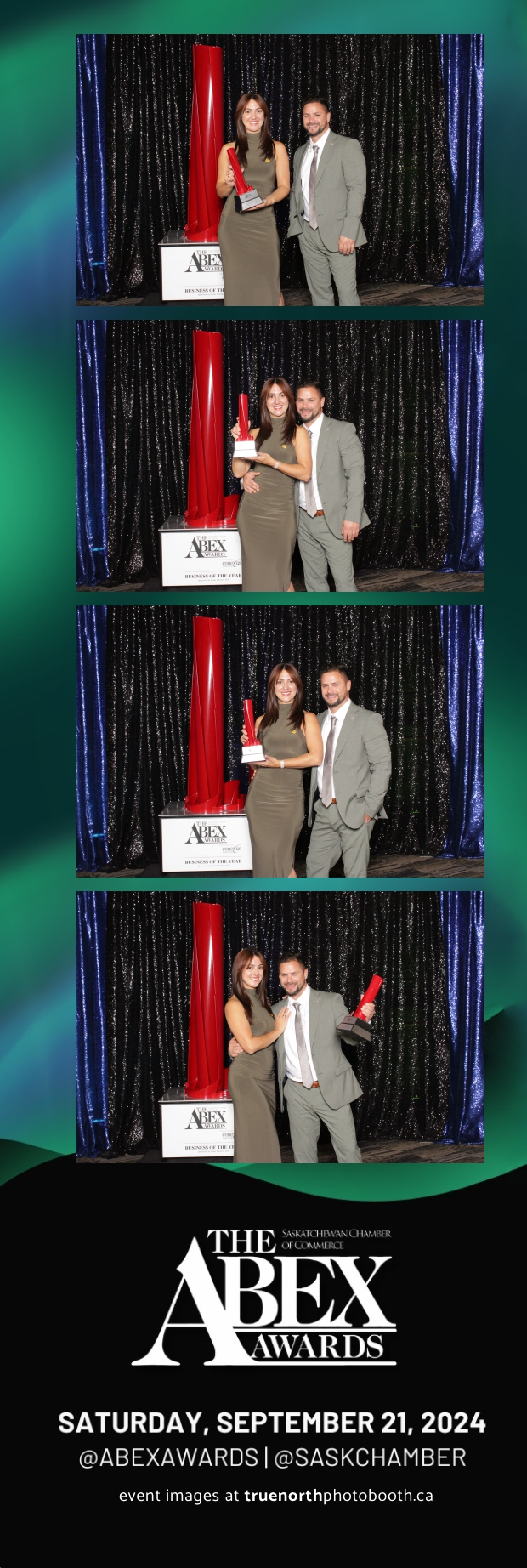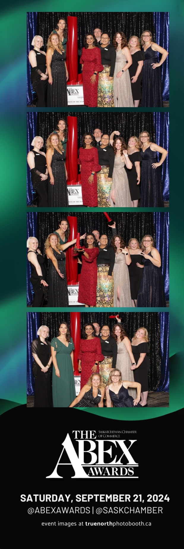 The Saskatchewan Chamber of Commerce once again put together an amazing evening for the 2024 ABEX Awards! Saskatchewan’s premier business event presented by Conexus Credit Union, was an unforgettable evening celebrating excellence in local business. Held at the prestigious TCU Place in Saskatoon, the event honored the incredible achievements of businesses that have made a significant impact since the awards’ inception in 1984. True North Photo Booth was proud to be part of this glamorous celebration, adding a fun and interactive element to the night with our 2X6 custom photo strips and the company’s own striking custom backdrop.