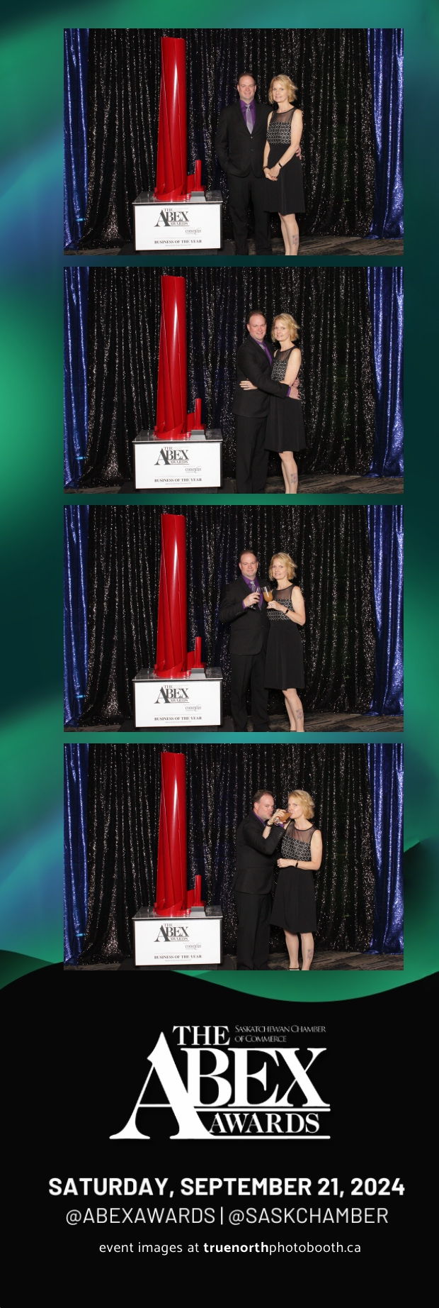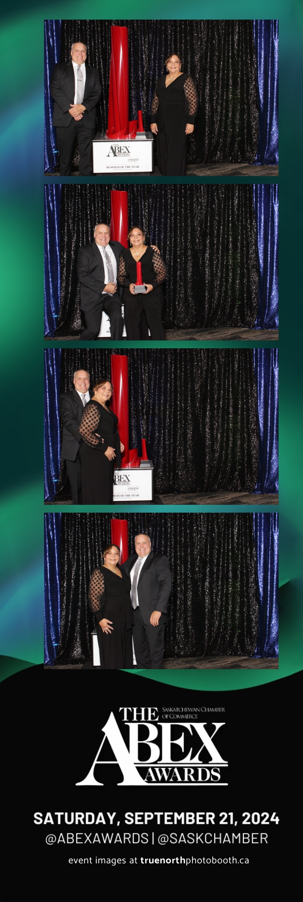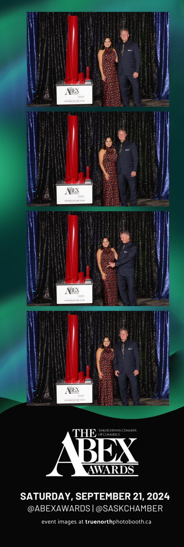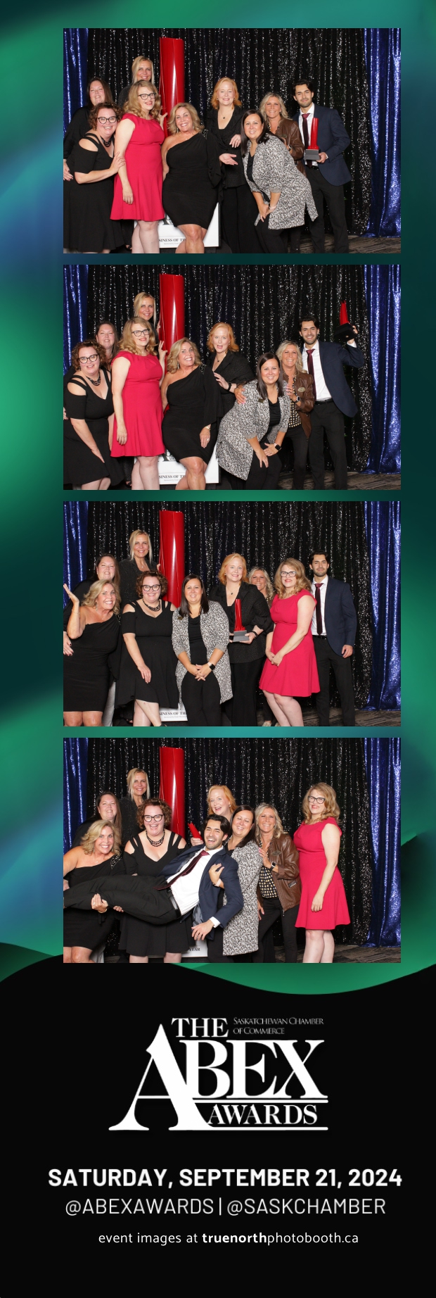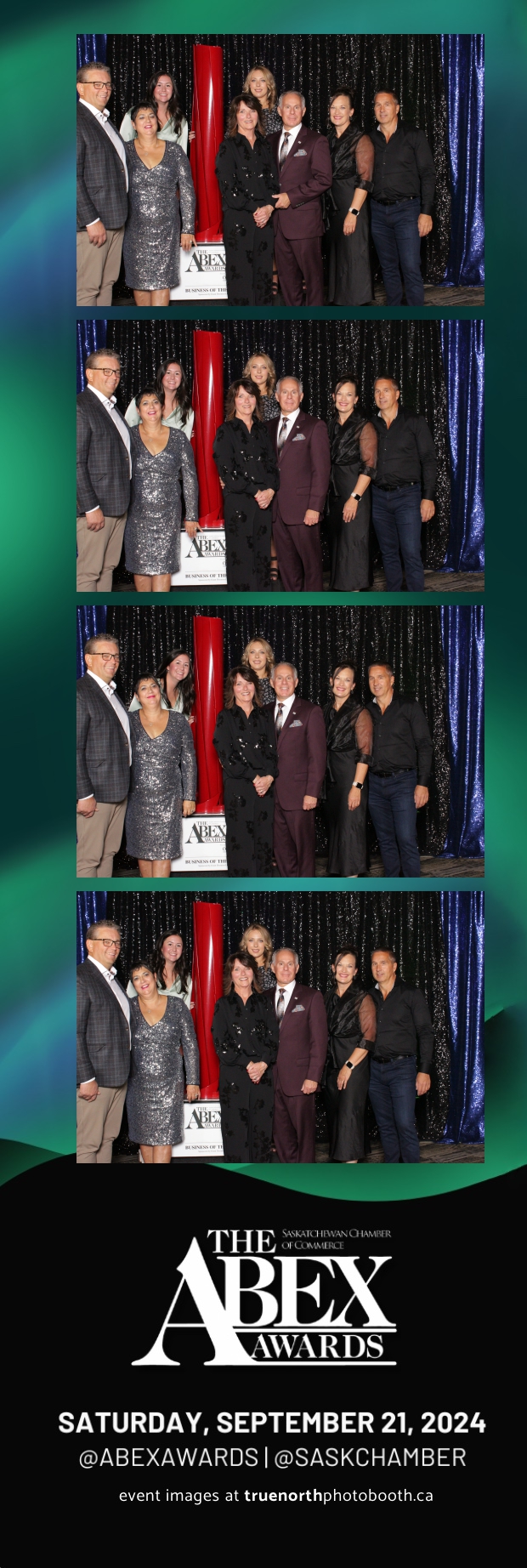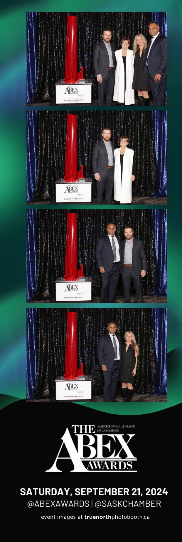 The Saskatchewan Chamber of Commerce once again put together an amazing evening for the 2024 ABEX Awards! Saskatchewan’s premier business event presented by Conexus Credit Union, was an unforgettable evening celebrating excellence in local business. Held at the prestigious TCU Place in Saskatoon, the event honored the incredible achievements of businesses that have made a significant impact since the awards’ inception in 1984. True North Photo Booth was proud to be part of this glamorous celebration, adding a fun and interactive element to the night with our 2X6 custom photo strips and the company’s own striking custom backdrop.