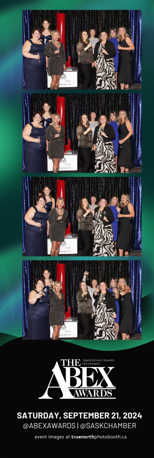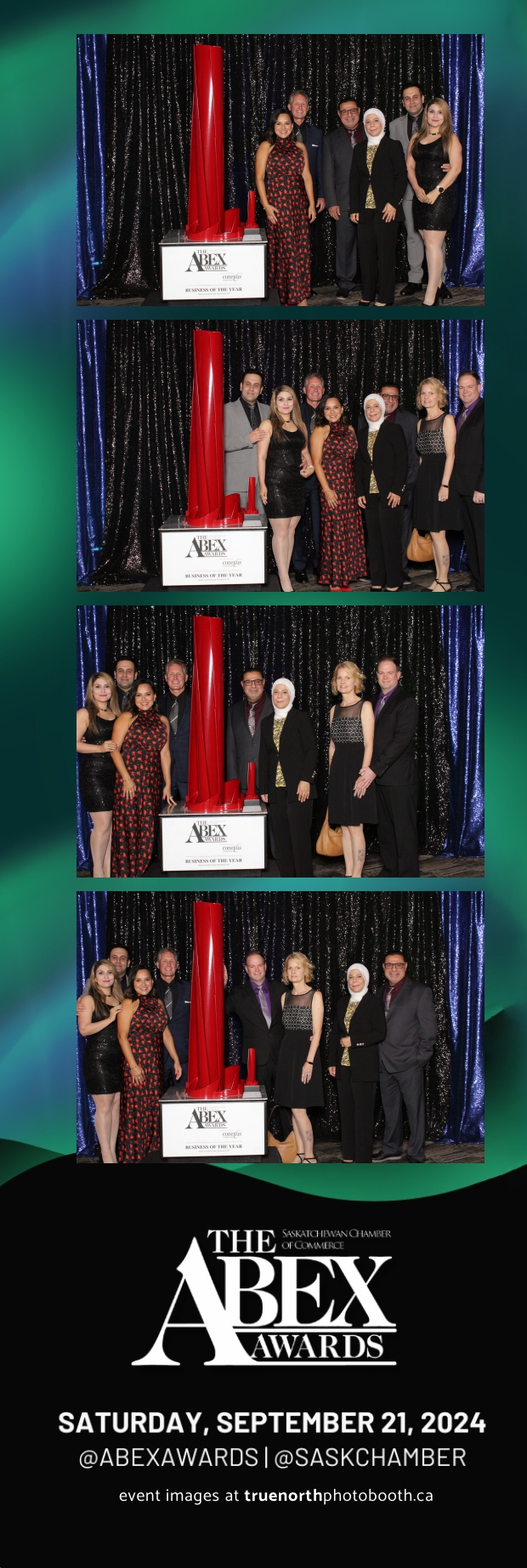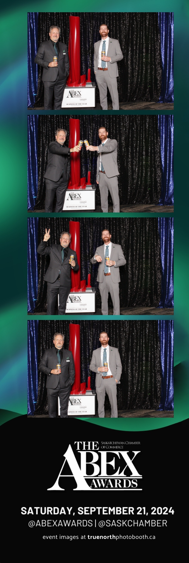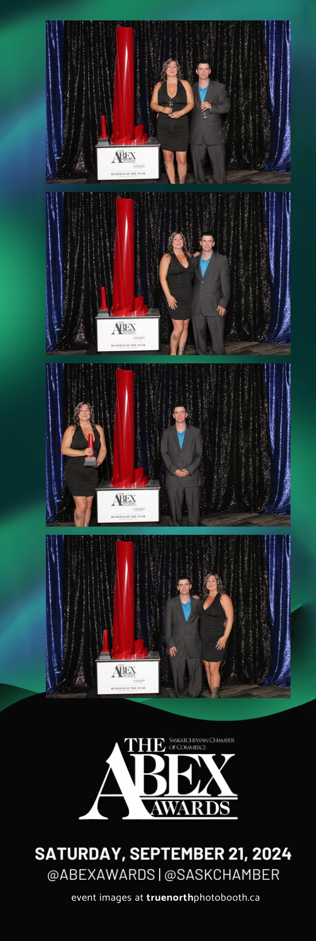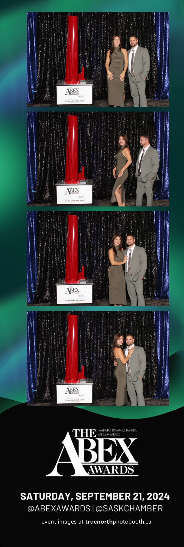 The Saskatchewan Chamber of Commerce once again put together an amazing evening for the 2024 ABEX Awards! Saskatchewan’s premier business event presented by Conexus Credit Union, was an unforgettable evening celebrating excellence in local business. Held at the prestigious TCU Place in Saskatoon, the event honored the incredible achievements of businesses that have made a significant impact since the awards’ inception in 1984. True North Photo Booth was proud to be part of this glamorous celebration, adding a fun and interactive element to the night with our 2X6 custom photo strips and the company’s own striking custom backdrop.