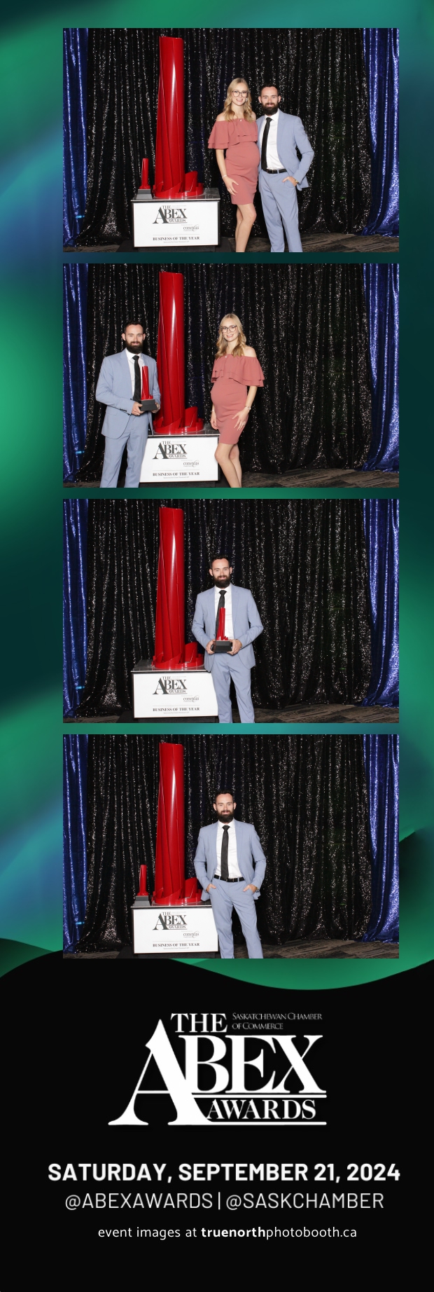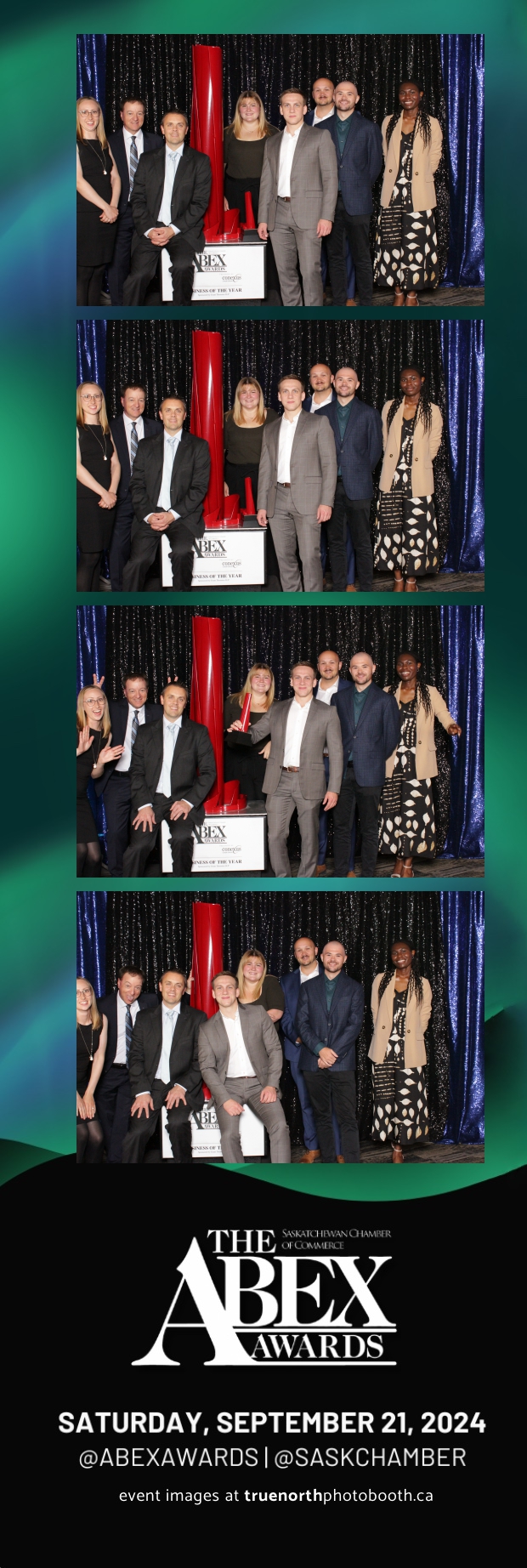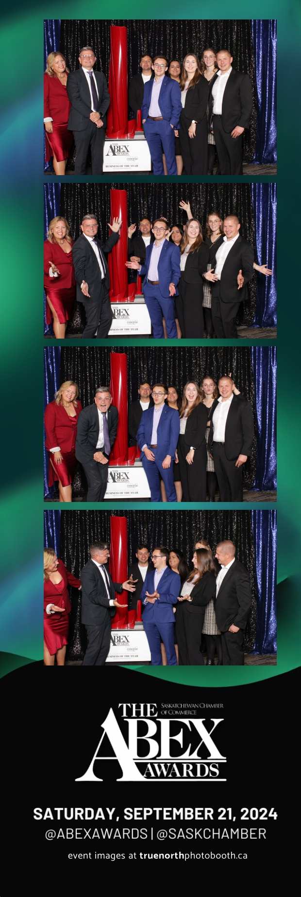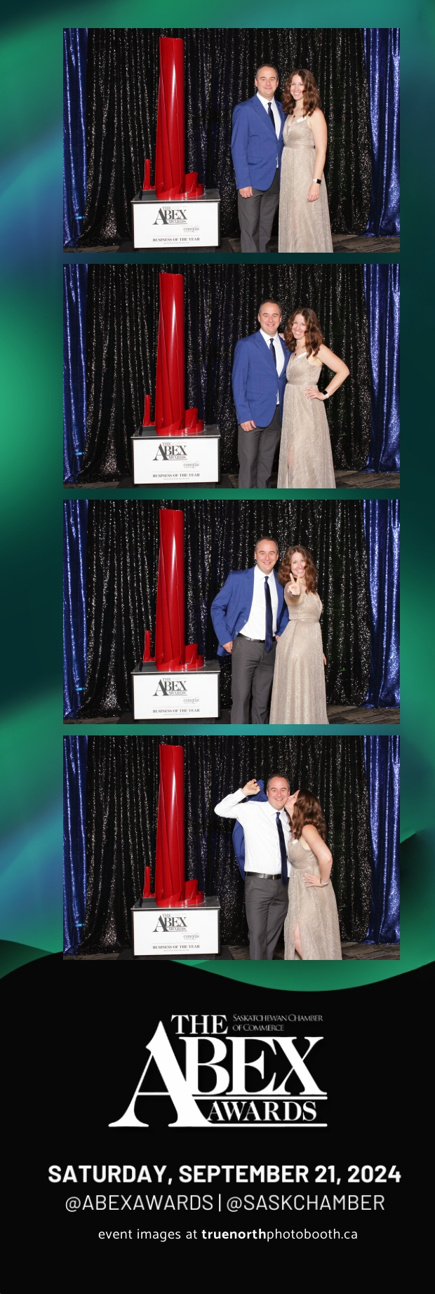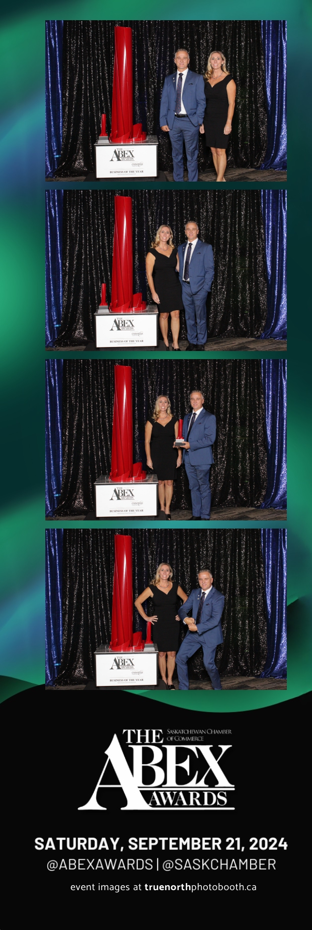 The Saskatchewan Chamber of Commerce once again put together an amazing evening for the 2024 ABEX Awards! Saskatchewan’s premier business event presented by Conexus Credit Union, was an unforgettable evening celebrating excellence in local business. Held at the prestigious TCU Place in Saskatoon, the event honored the incredible achievements of businesses that have made a significant impact since the awards’ inception in 1984. True North Photo Booth was proud to be part of this glamorous celebration, adding a fun and interactive element to the night with our 2X6 custom photo strips and the company’s own striking custom backdrop.