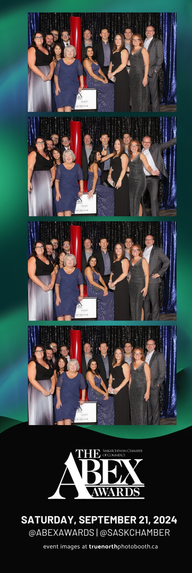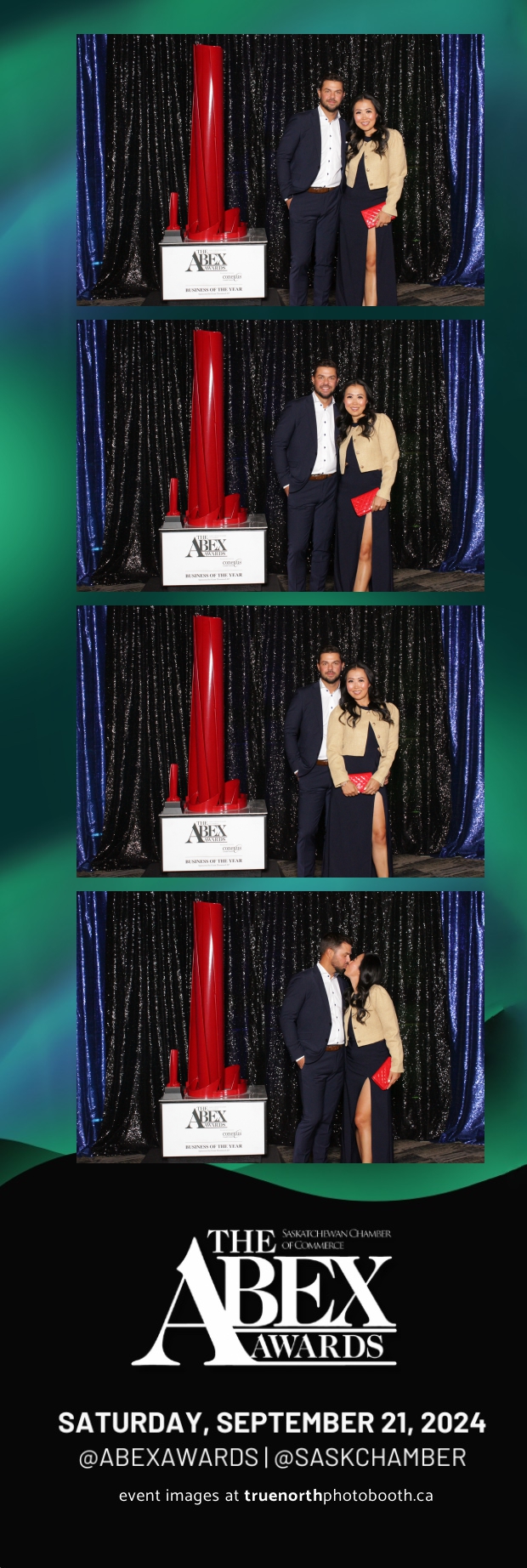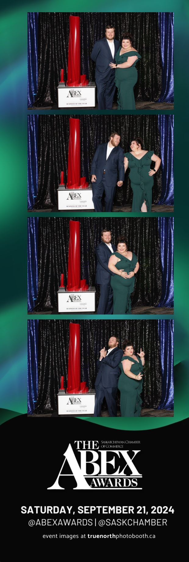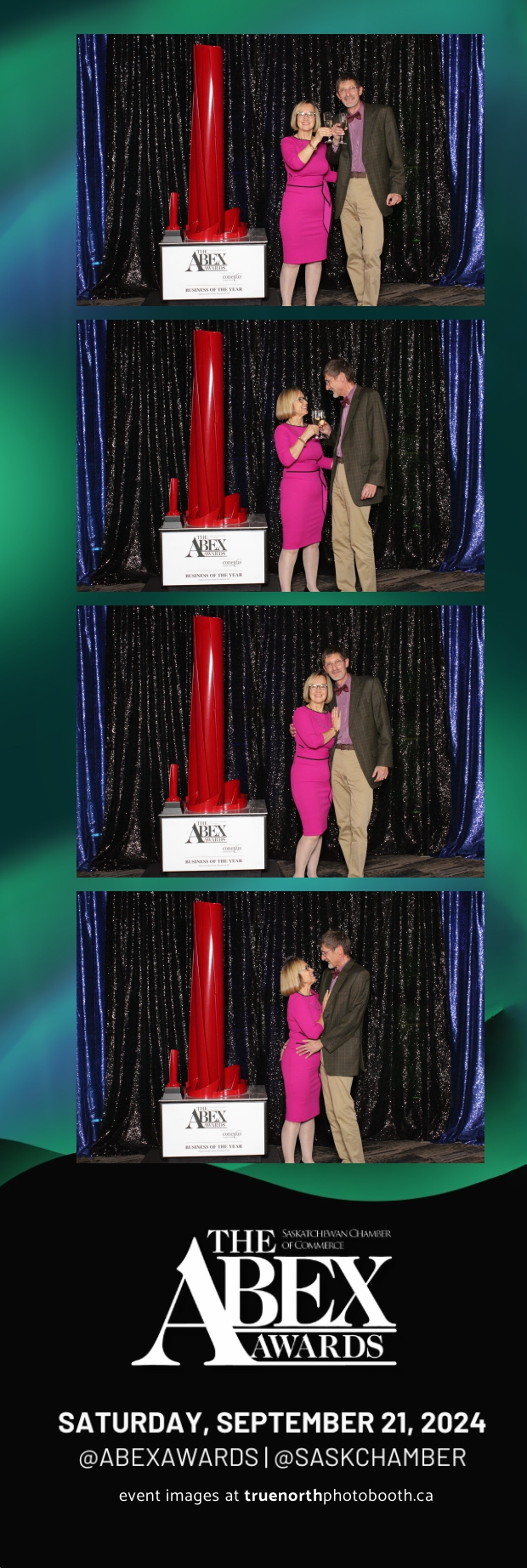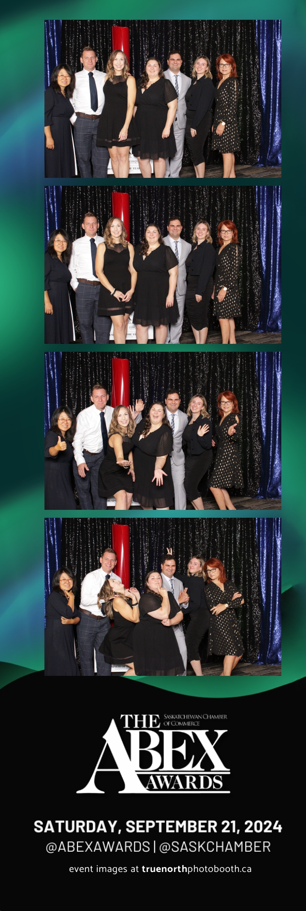 The Saskatchewan Chamber of Commerce once again put together an amazing evening for the 2024 ABEX Awards! Saskatchewan’s premier business event presented by Conexus Credit Union, was an unforgettable evening celebrating excellence in local business. Held at the prestigious TCU Place in Saskatoon, the event honored the incredible achievements of businesses that have made a significant impact since the awards’ inception in 1984. True North Photo Booth was proud to be part of this glamorous celebration, adding a fun and interactive element to the night with our 2X6 custom photo strips and the company’s own striking custom backdrop.