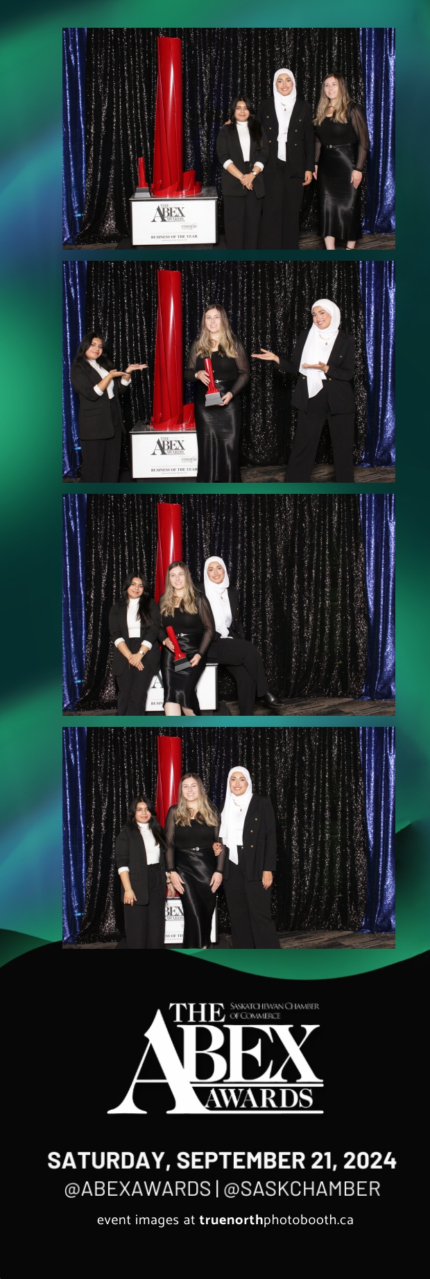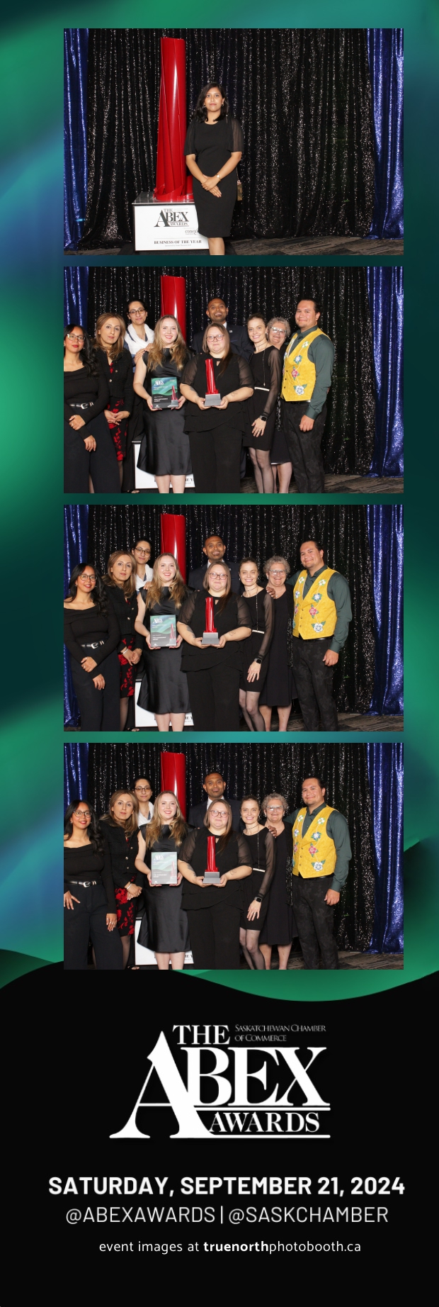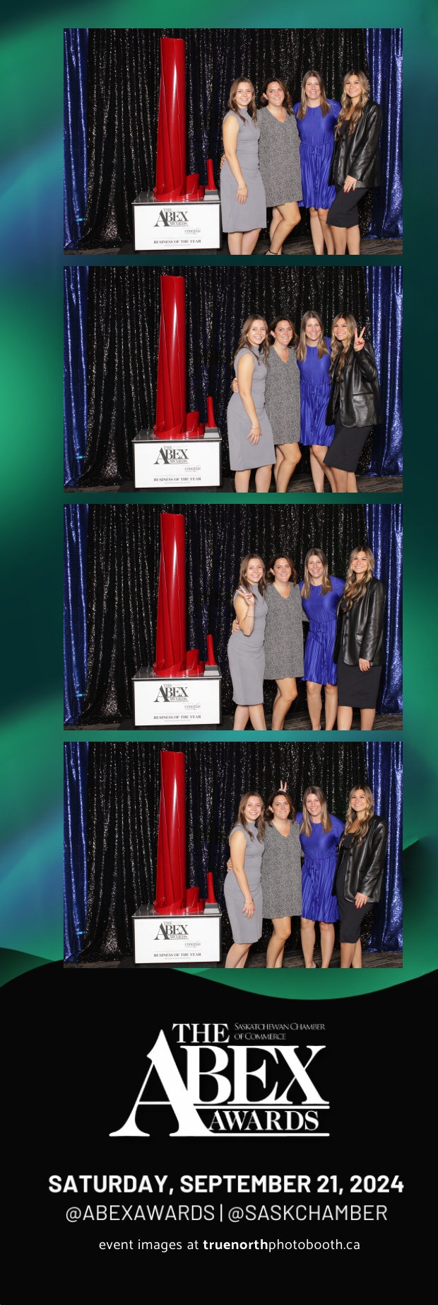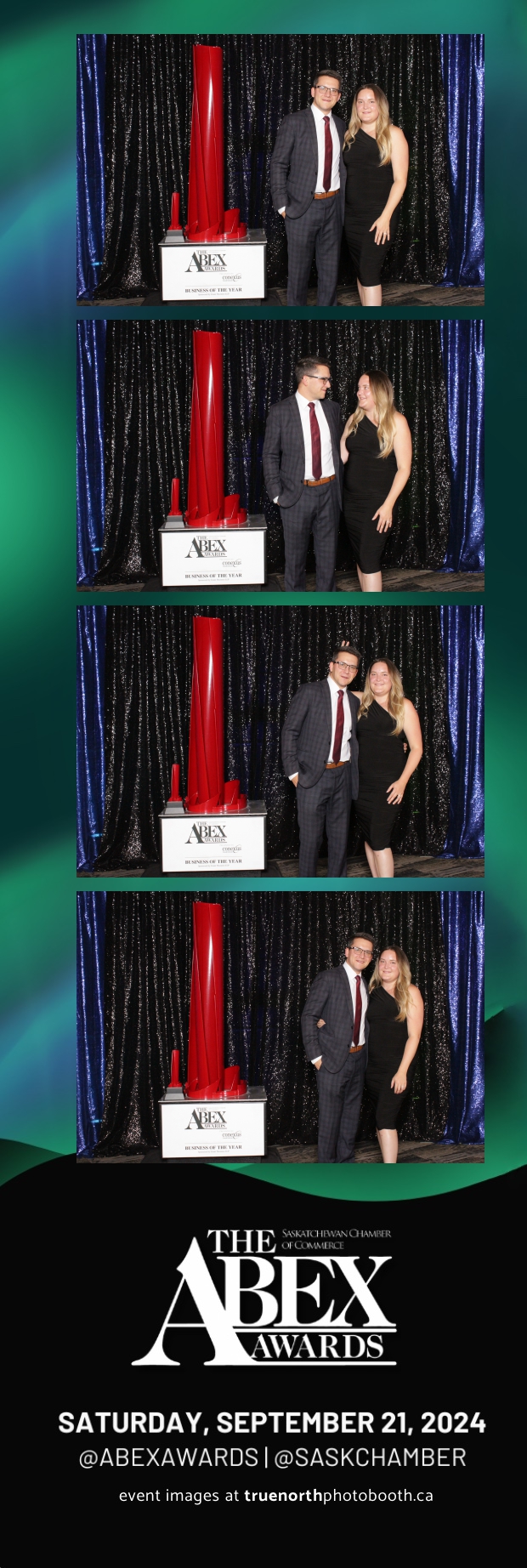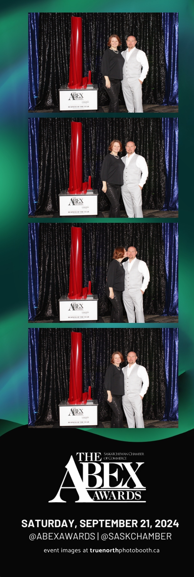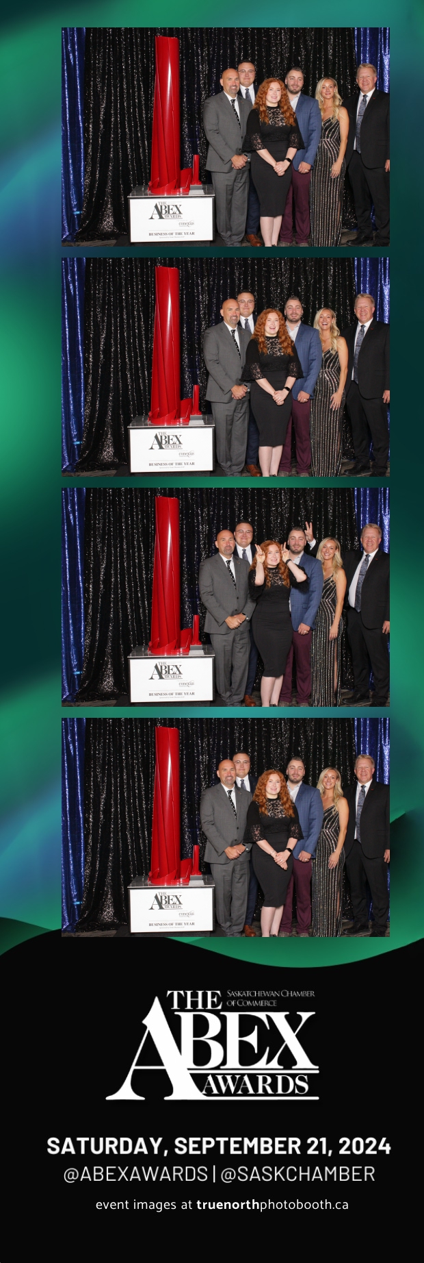 The Saskatchewan Chamber of Commerce once again put together an amazing evening for the 2024 ABEX Awards! Saskatchewan’s premier business event presented by Conexus Credit Union, was an unforgettable evening celebrating excellence in local business. Held at the prestigious TCU Place in Saskatoon, the event honored the incredible achievements of businesses that have made a significant impact since the awards’ inception in 1984. True North Photo Booth was proud to be part of this glamorous celebration, adding a fun and interactive element to the night with our 2X6 custom photo strips and the company’s own striking custom backdrop.