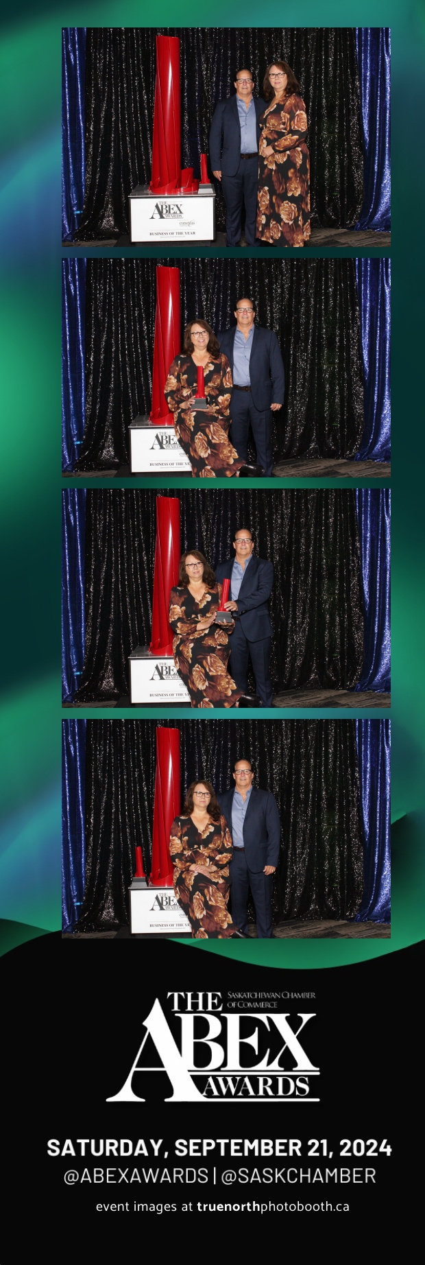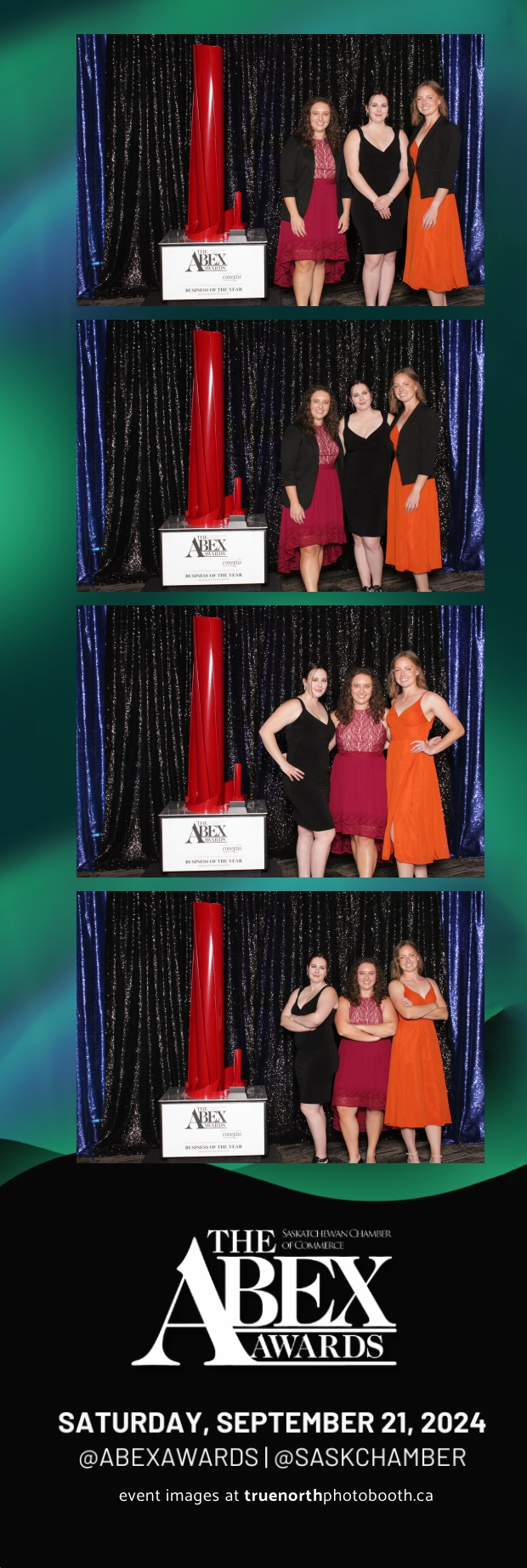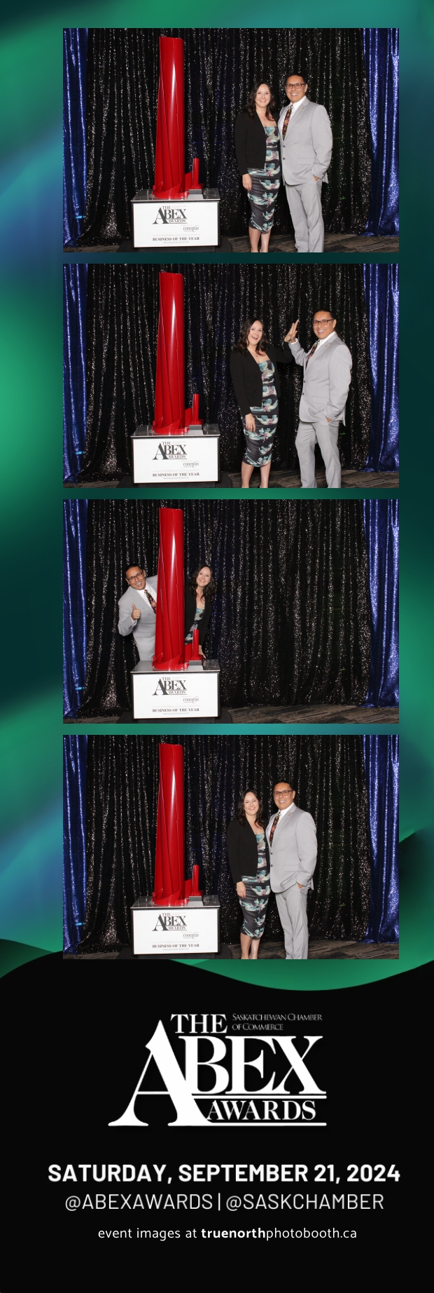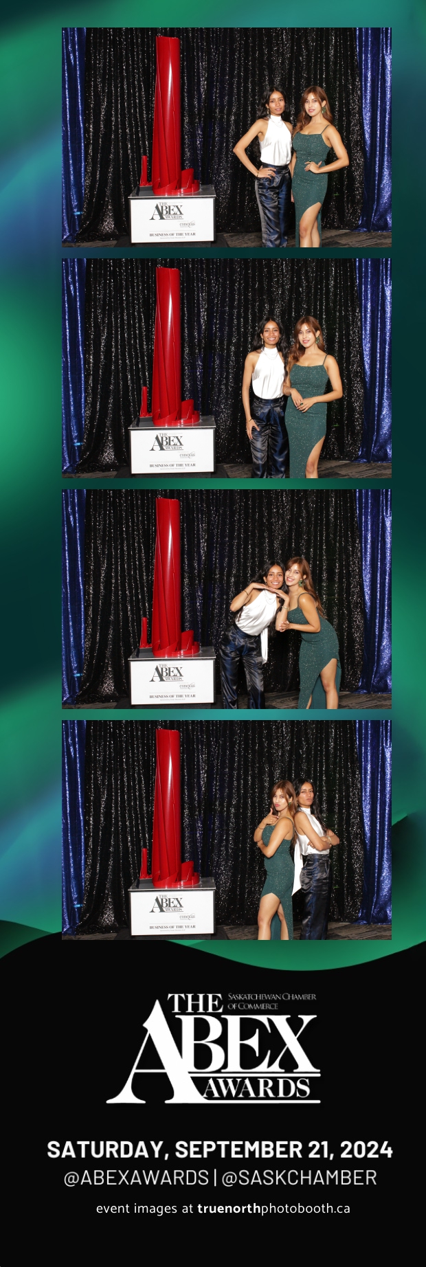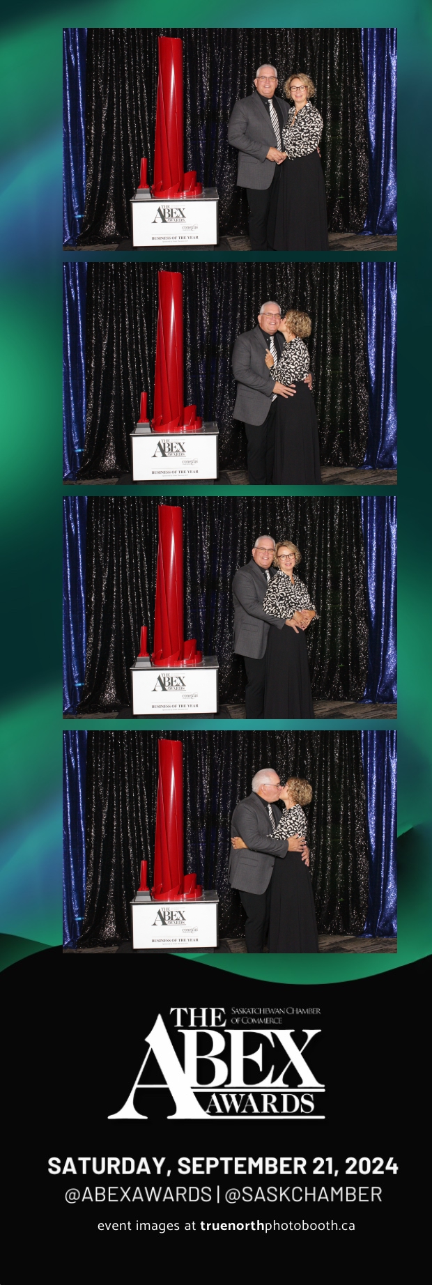 The Saskatchewan Chamber of Commerce once again put together an amazing evening for the 2024 ABEX Awards! Saskatchewan’s premier business event presented by Conexus Credit Union, was an unforgettable evening celebrating excellence in local business. Held at the prestigious TCU Place in Saskatoon, the event honored the incredible achievements of businesses that have made a significant impact since the awards’ inception in 1984. True North Photo Booth was proud to be part of this glamorous celebration, adding a fun and interactive element to the night with our 2X6 custom photo strips and the company’s own striking custom backdrop.