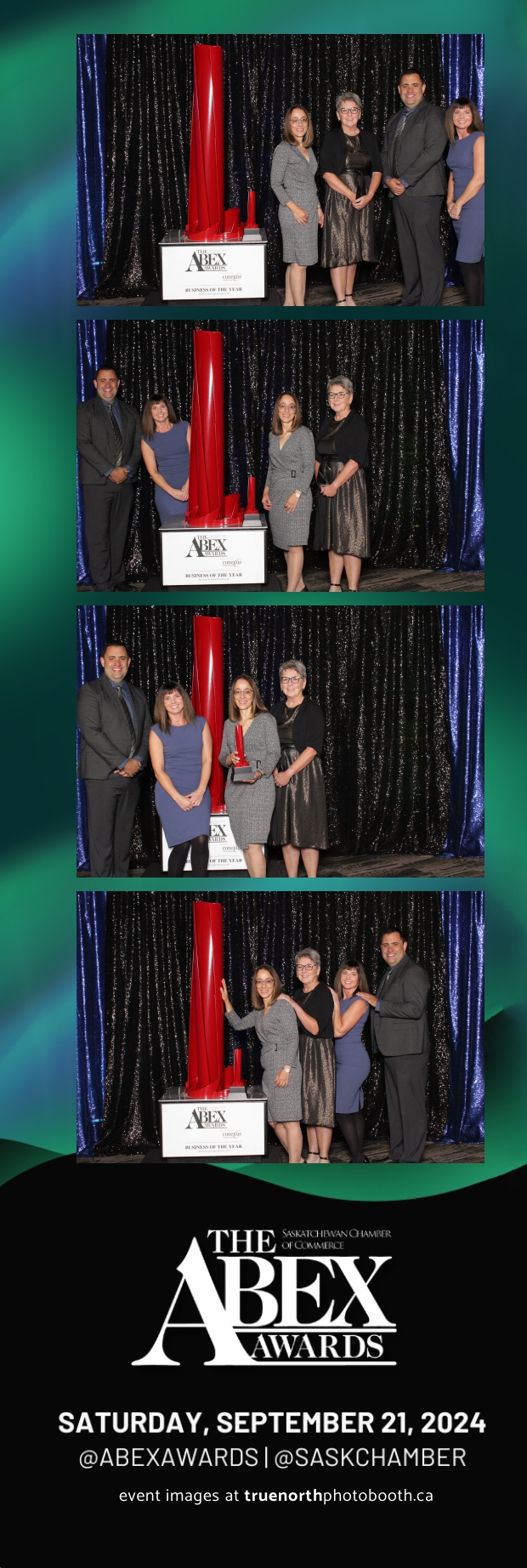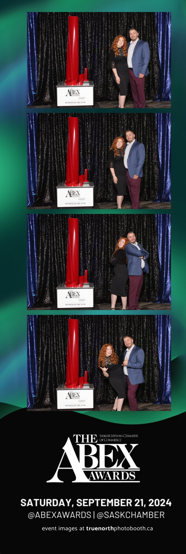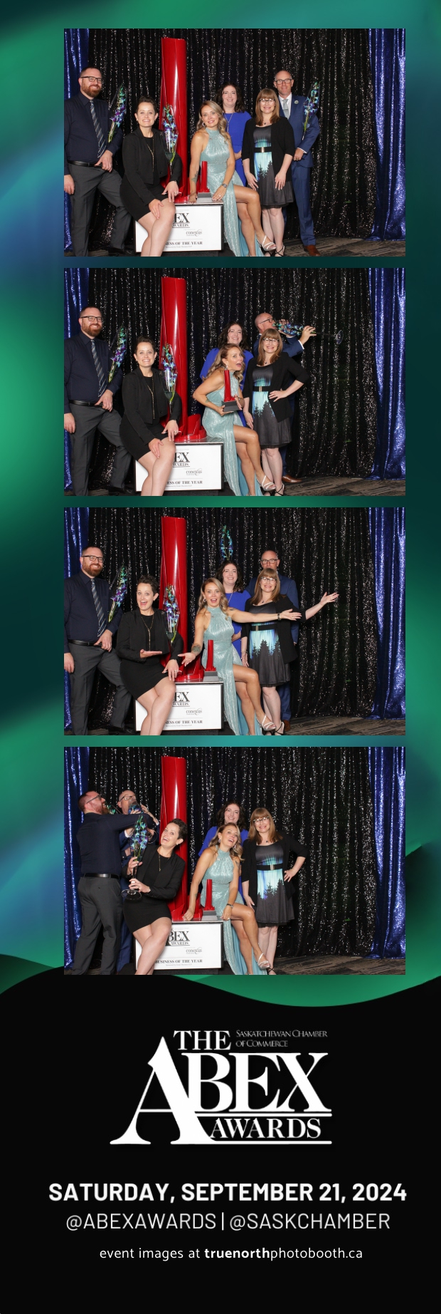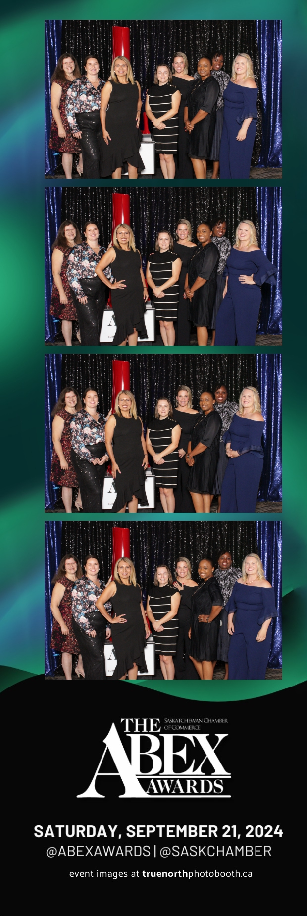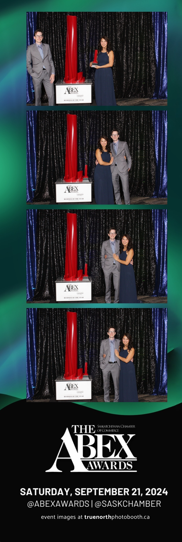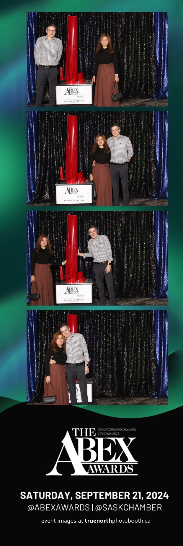 The Saskatchewan Chamber of Commerce once again put together an amazing evening for the 2024 ABEX Awards! Saskatchewan’s premier business event presented by Conexus Credit Union, was an unforgettable evening celebrating excellence in local business. Held at the prestigious TCU Place in Saskatoon, the event honored the incredible achievements of businesses that have made a significant impact since the awards’ inception in 1984. True North Photo Booth was proud to be part of this glamorous celebration, adding a fun and interactive element to the night with our 2X6 custom photo strips and the company’s own striking custom backdrop.
