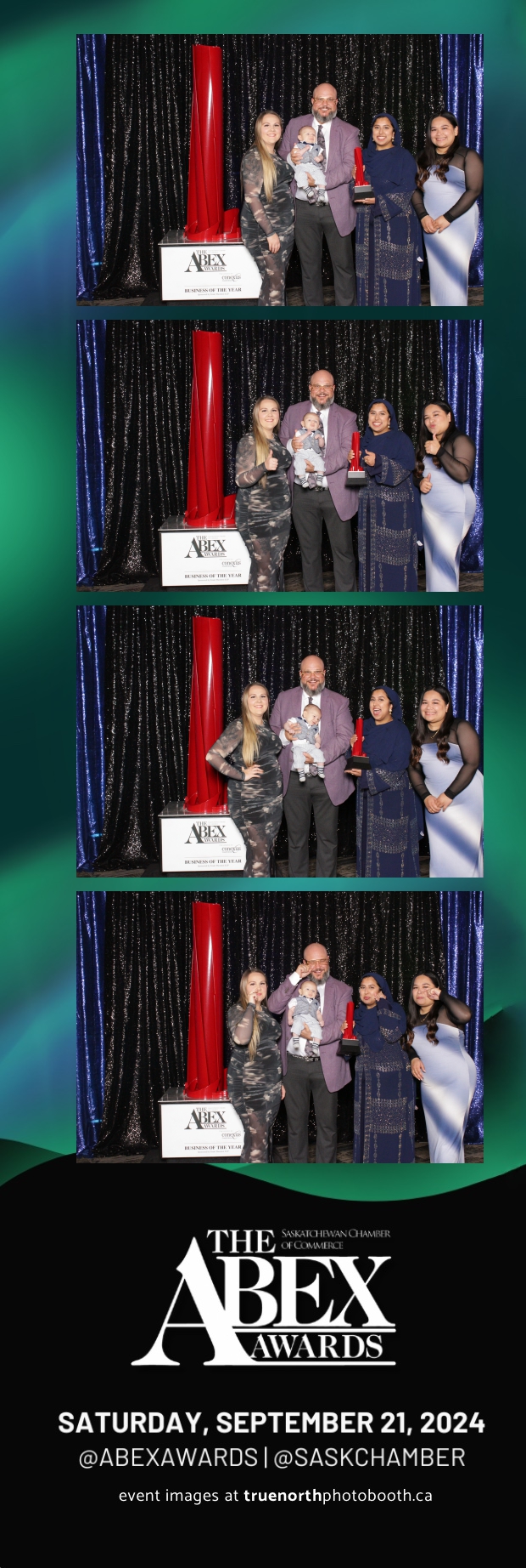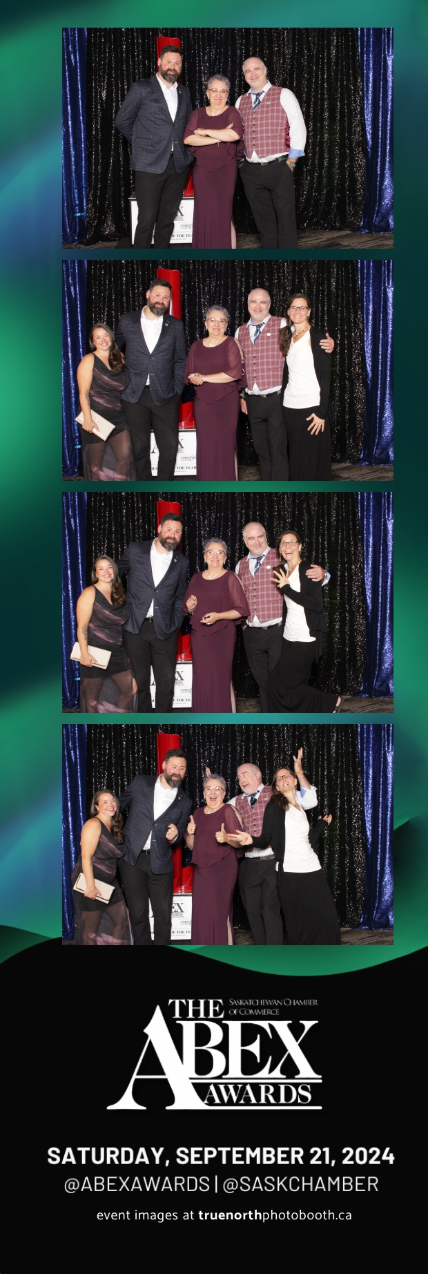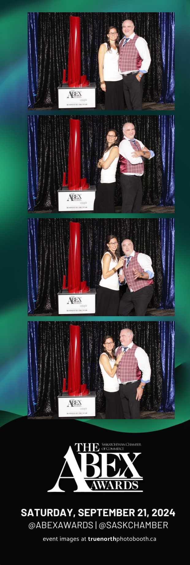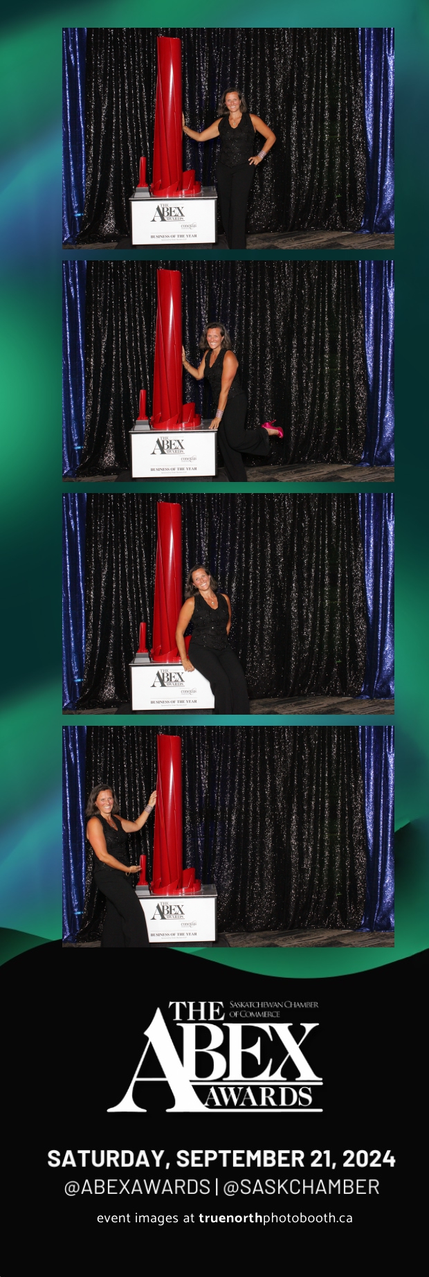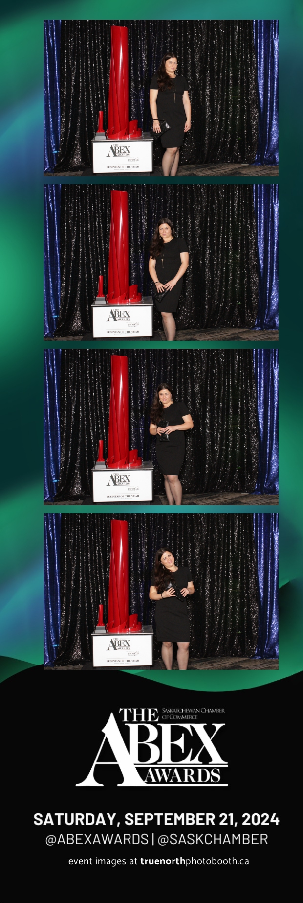 The Saskatchewan Chamber of Commerce once again put together an amazing evening for the 2024 ABEX Awards! Saskatchewan’s premier business event presented by Conexus Credit Union, was an unforgettable evening celebrating excellence in local business. Held at the prestigious TCU Place in Saskatoon, the event honored the incredible achievements of businesses that have made a significant impact since the awards’ inception in 1984. True North Photo Booth was proud to be part of this glamorous celebration, adding a fun and interactive element to the night with our 2X6 custom photo strips and the company’s own striking custom backdrop.