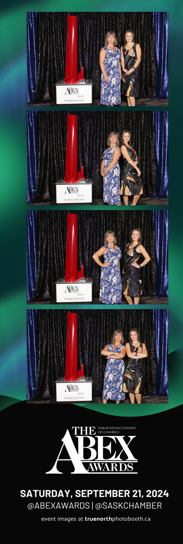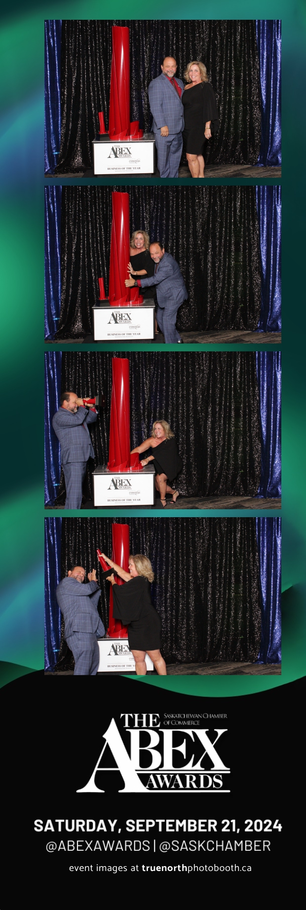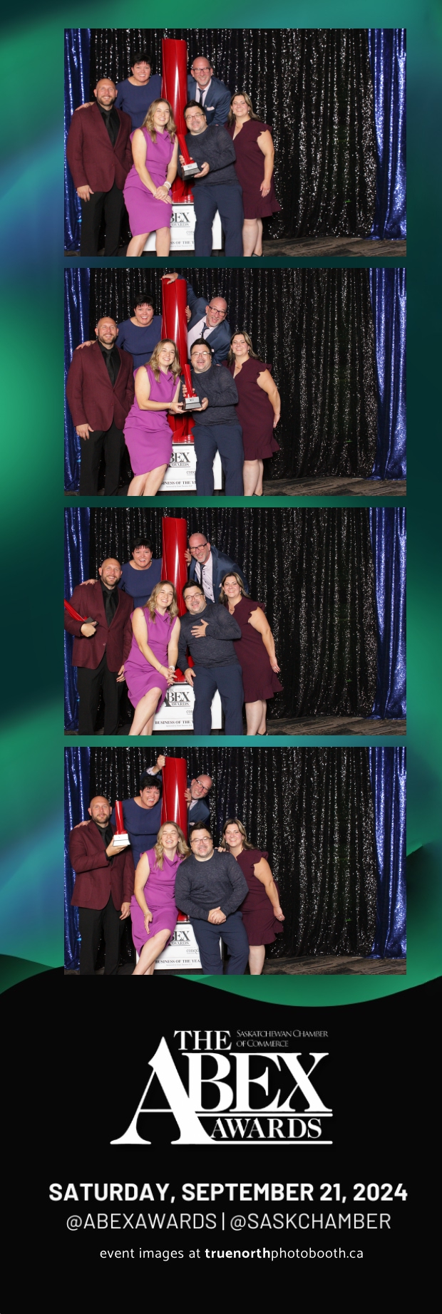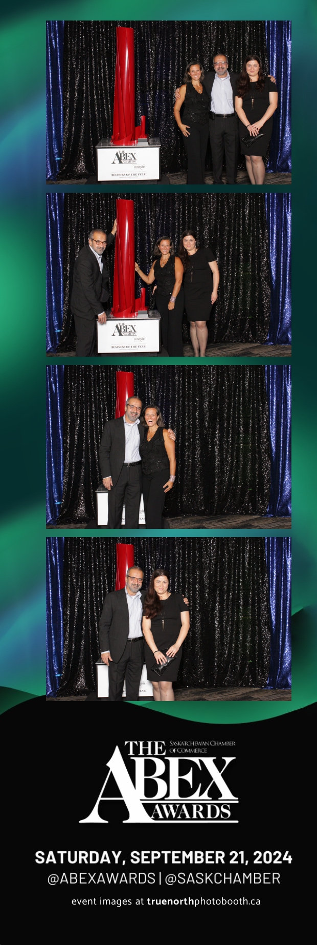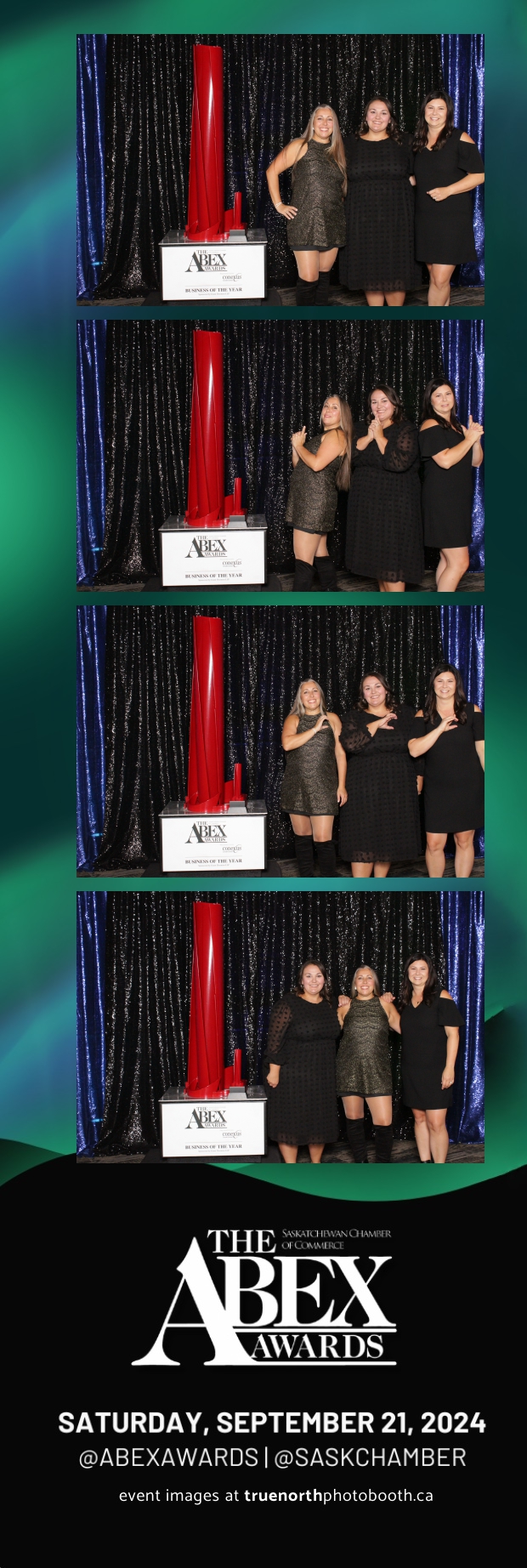 The Saskatchewan Chamber of Commerce once again put together an amazing evening for the 2024 ABEX Awards! Saskatchewan’s premier business event presented by Conexus Credit Union, was an unforgettable evening celebrating excellence in local business. Held at the prestigious TCU Place in Saskatoon, the event honored the incredible achievements of businesses that have made a significant impact since the awards’ inception in 1984. True North Photo Booth was proud to be part of this glamorous celebration, adding a fun and interactive element to the night with our 2X6 custom photo strips and the company’s own striking custom backdrop.