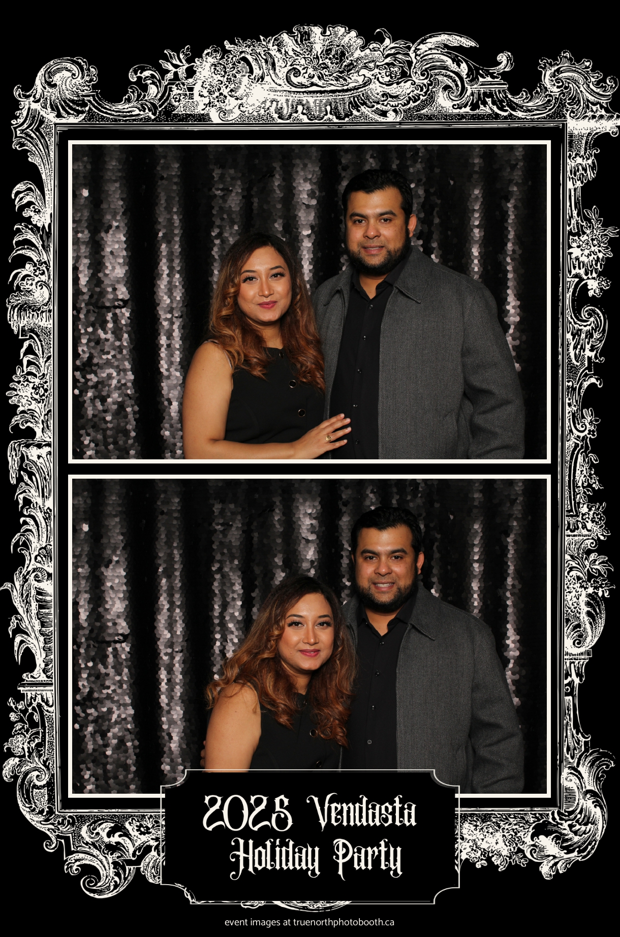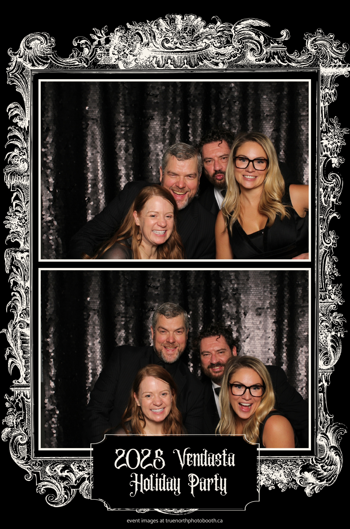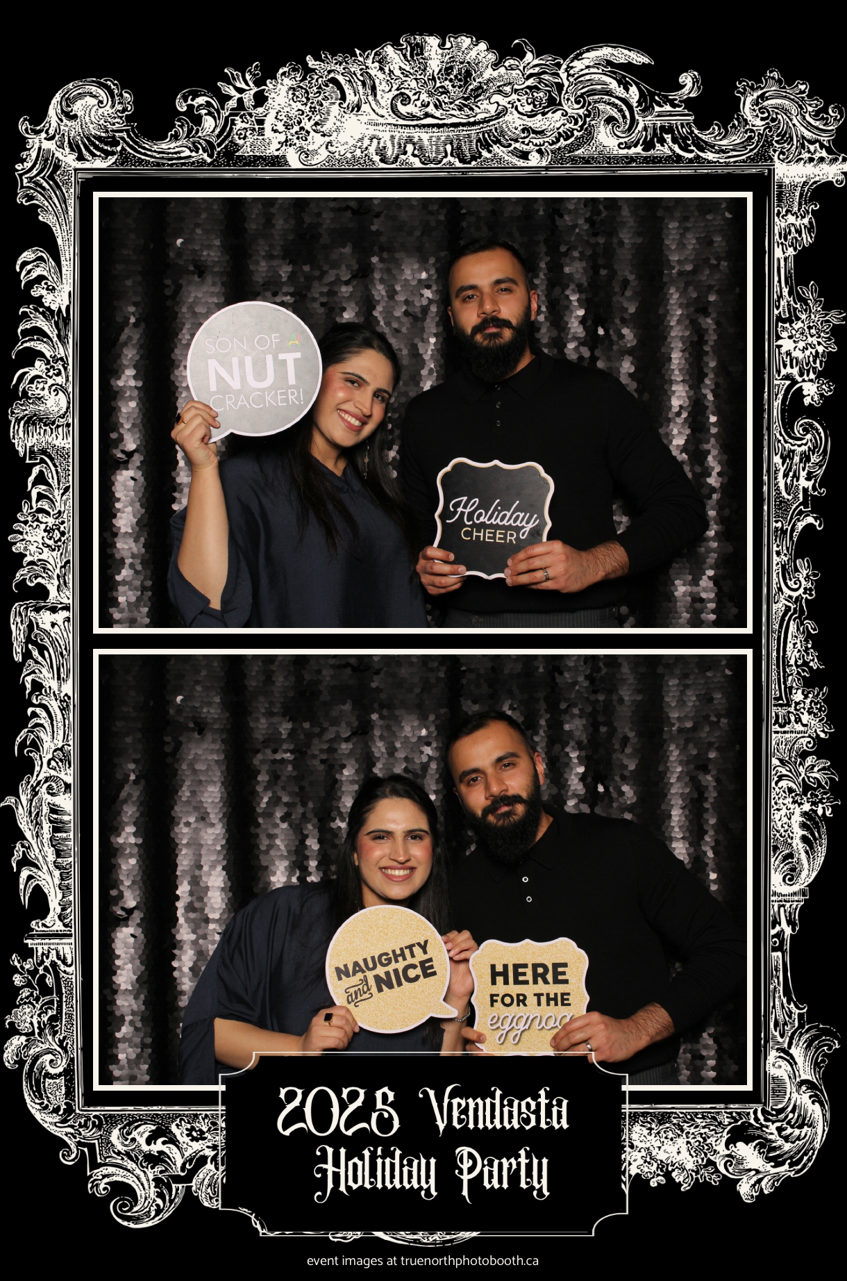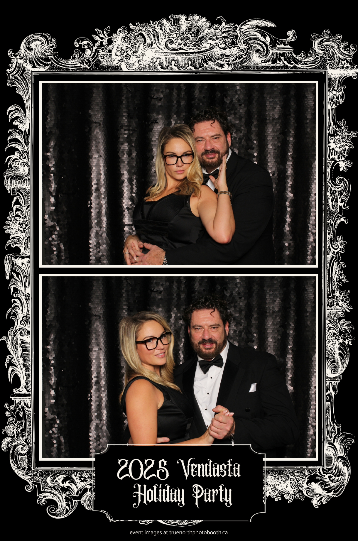 True North Photo Booth added to the excitement with a vibrant 4X6 Gold custom photo strip paired perfectly with a sleek Black Sequin Backdrop, giving guests a glamorous way to snap keepsake photos and take home memories from this spectacular holiday celebration.