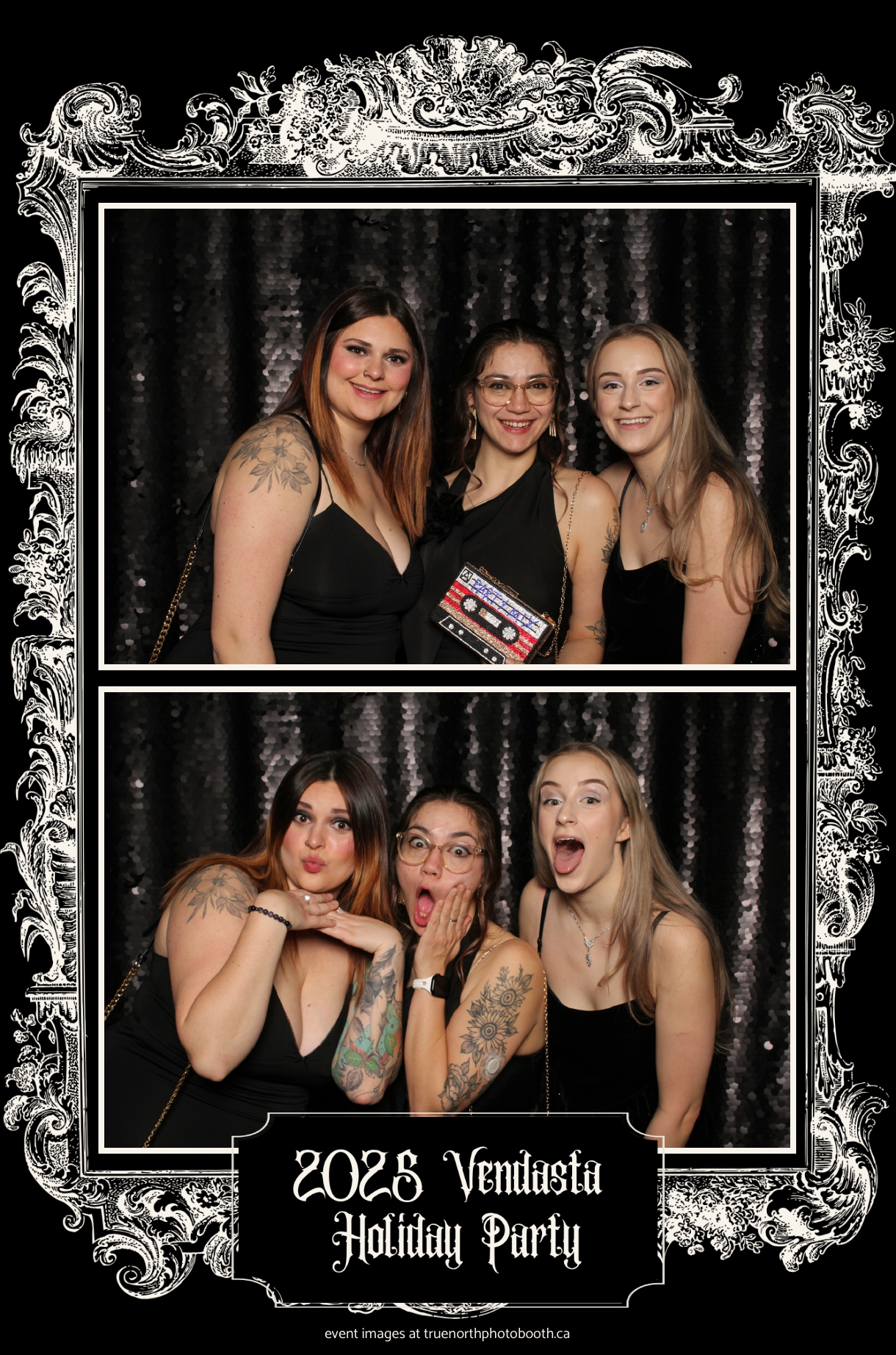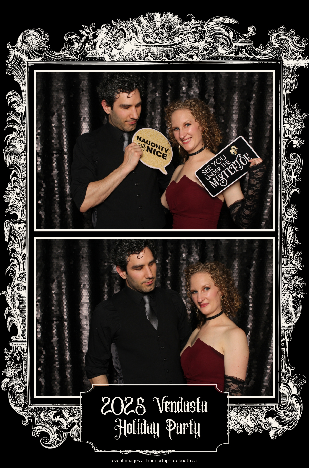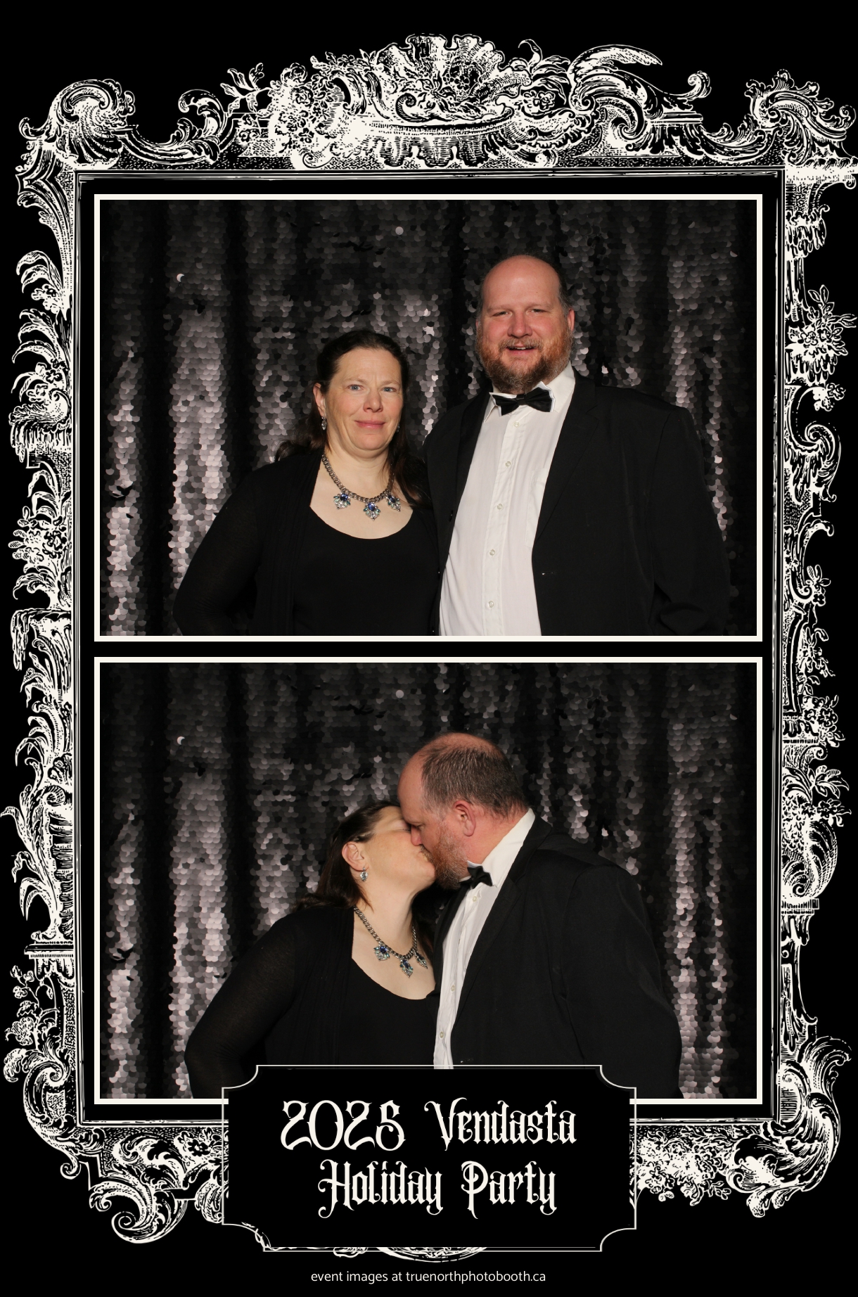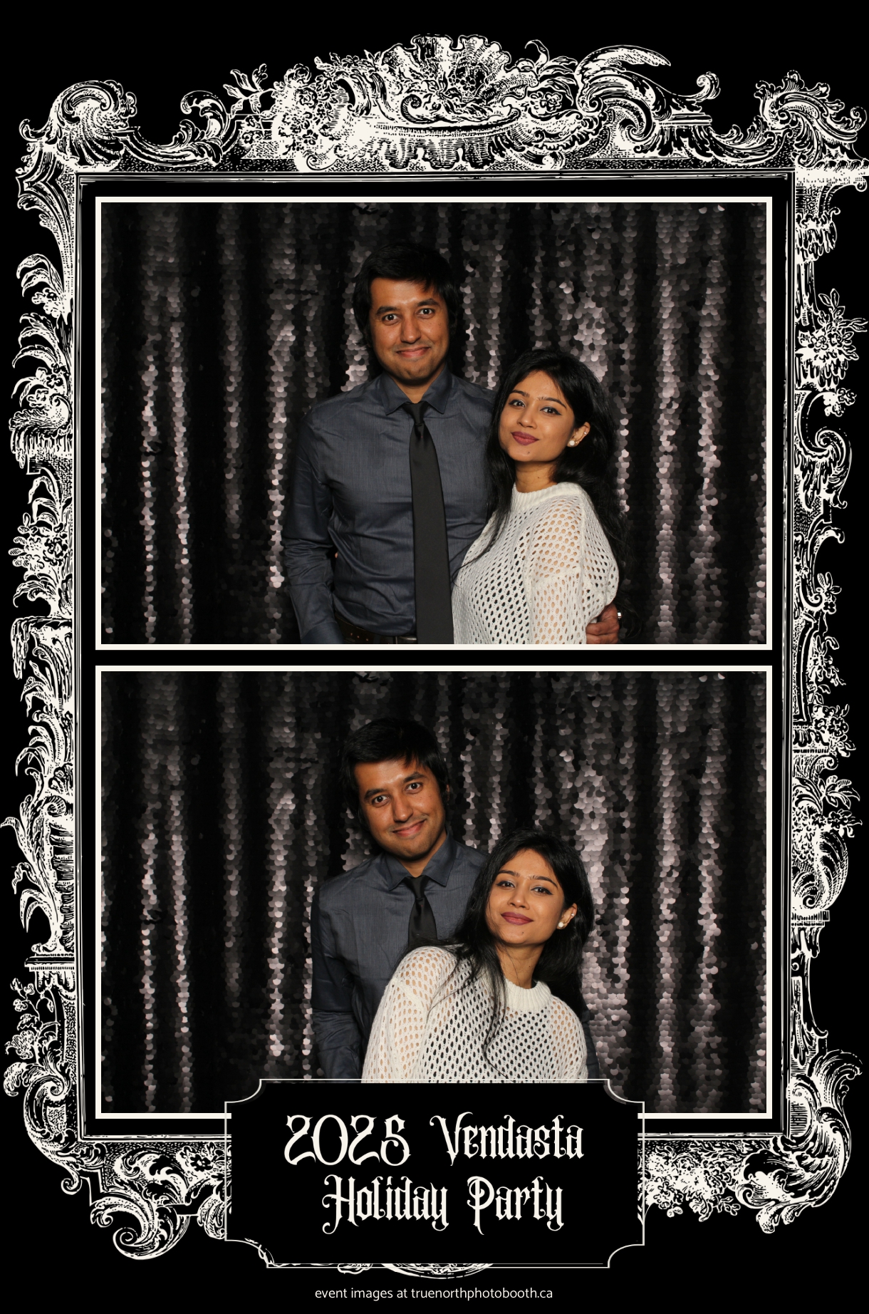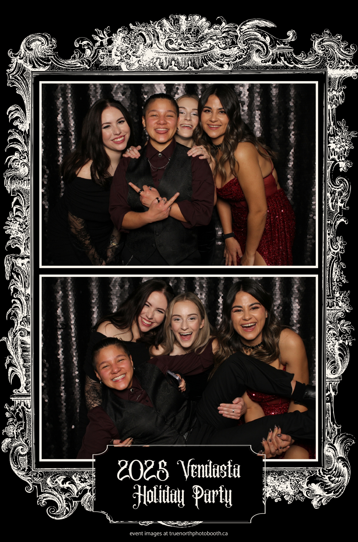True North Photo Booth added to the excitement with a vibrant 4X6 Gold custom photo strip paired perfectly with a sleek Black Sequin Backdrop, giving guests a glamorous way to snap keepsake photos and take home memories from this spectacular holiday celebration.