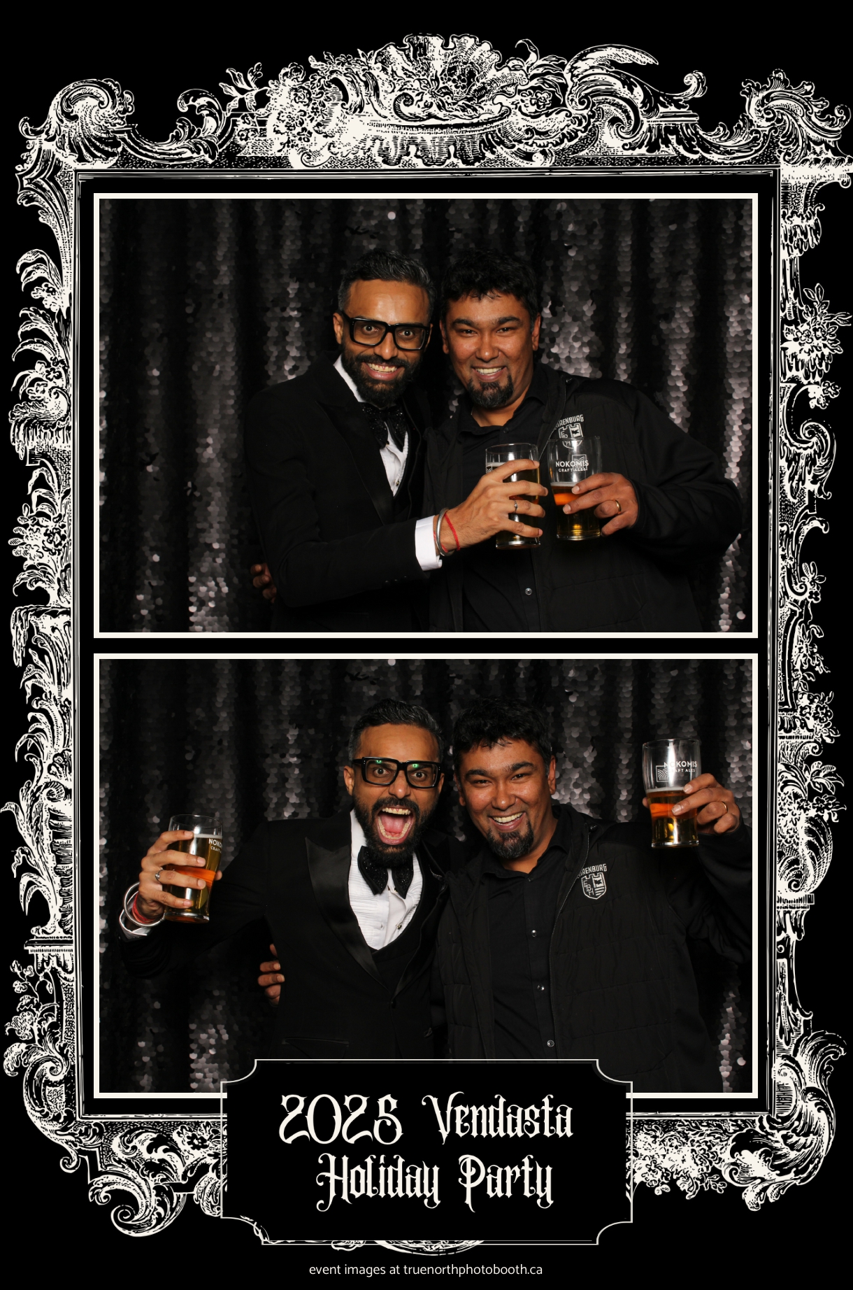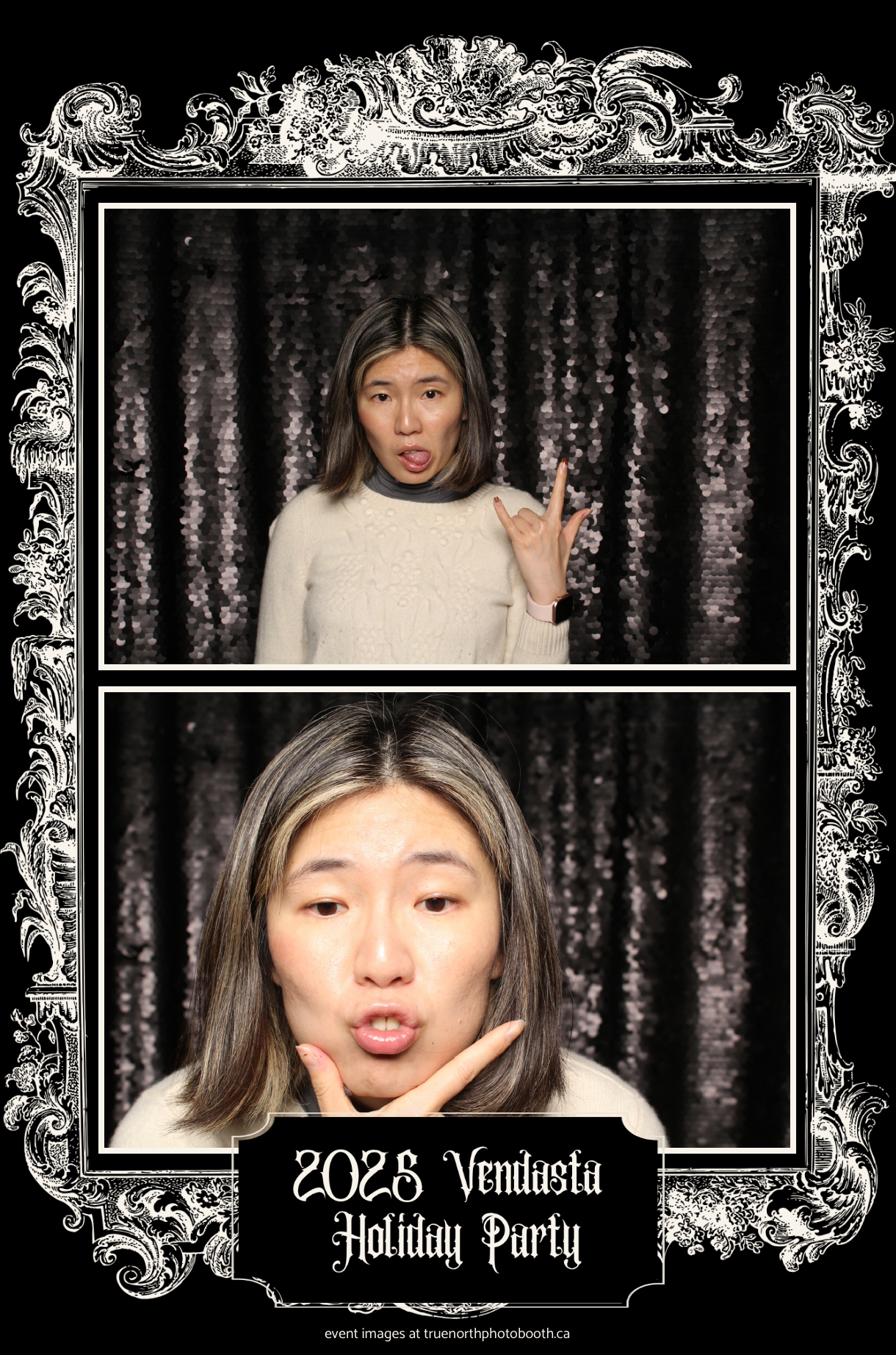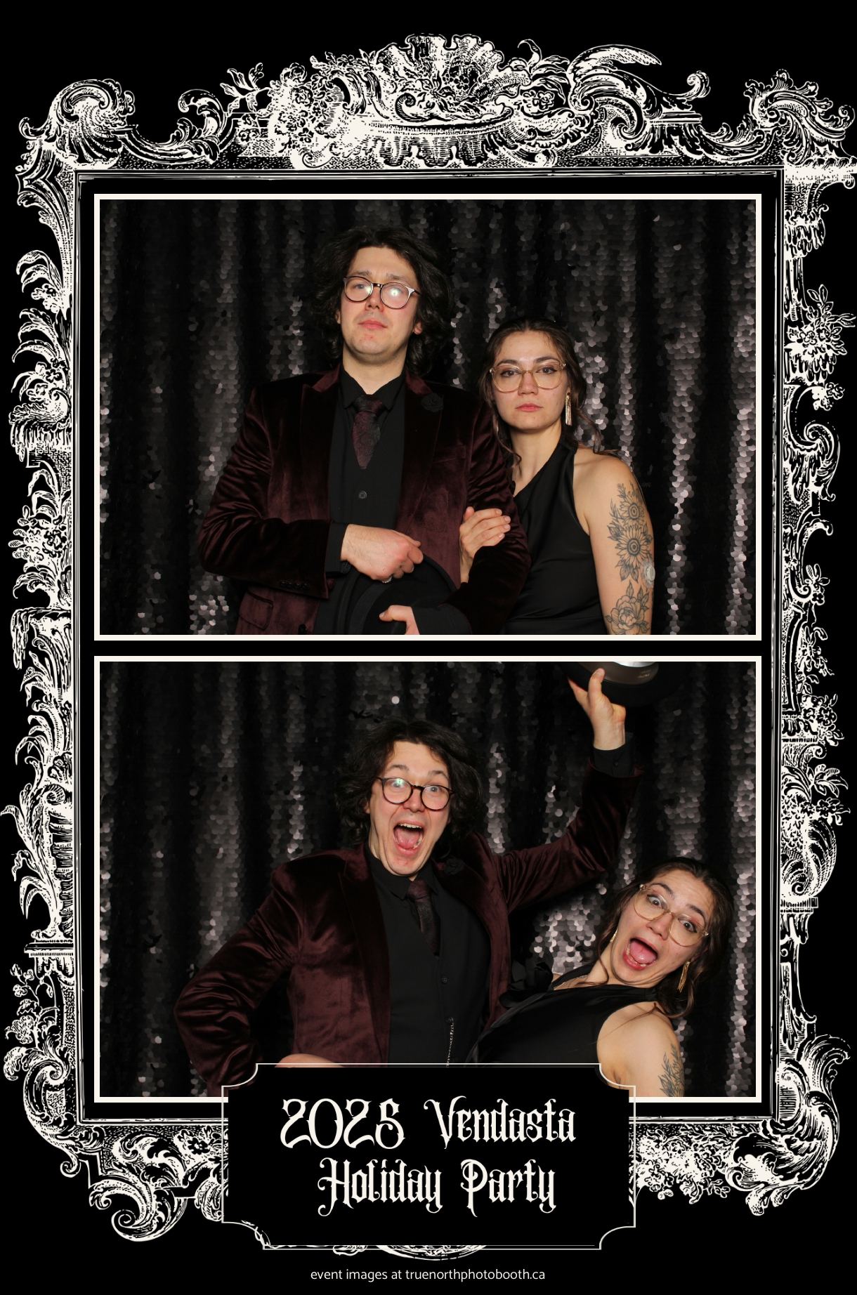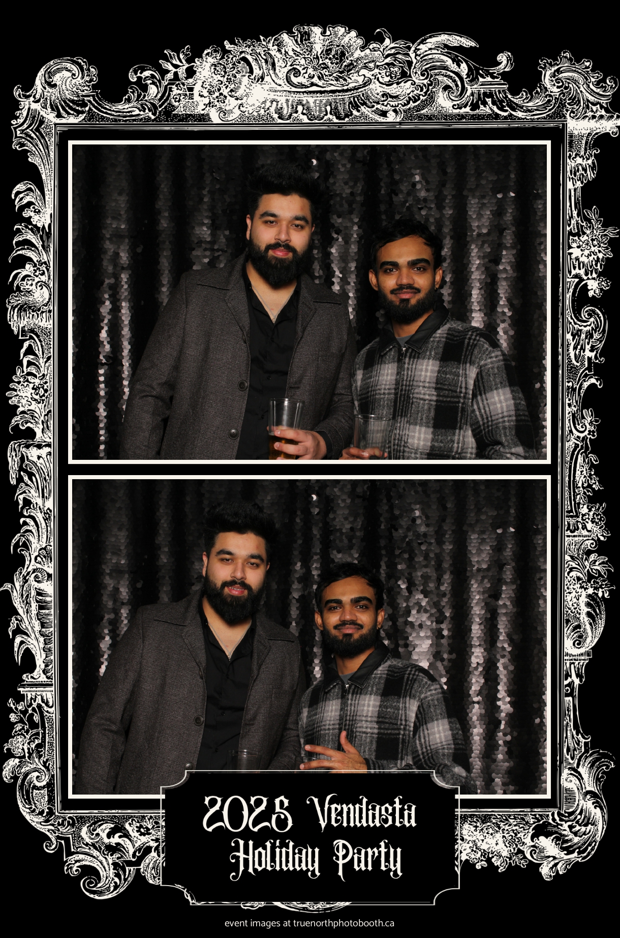 True North Photo Booth added to the excitement with a vibrant 4X6 Gold custom photo strip paired perfectly with a sleek Black Sequin Backdrop, giving guests a glamorous way to snap keepsake photos and take home memories from this spectacular holiday celebration.