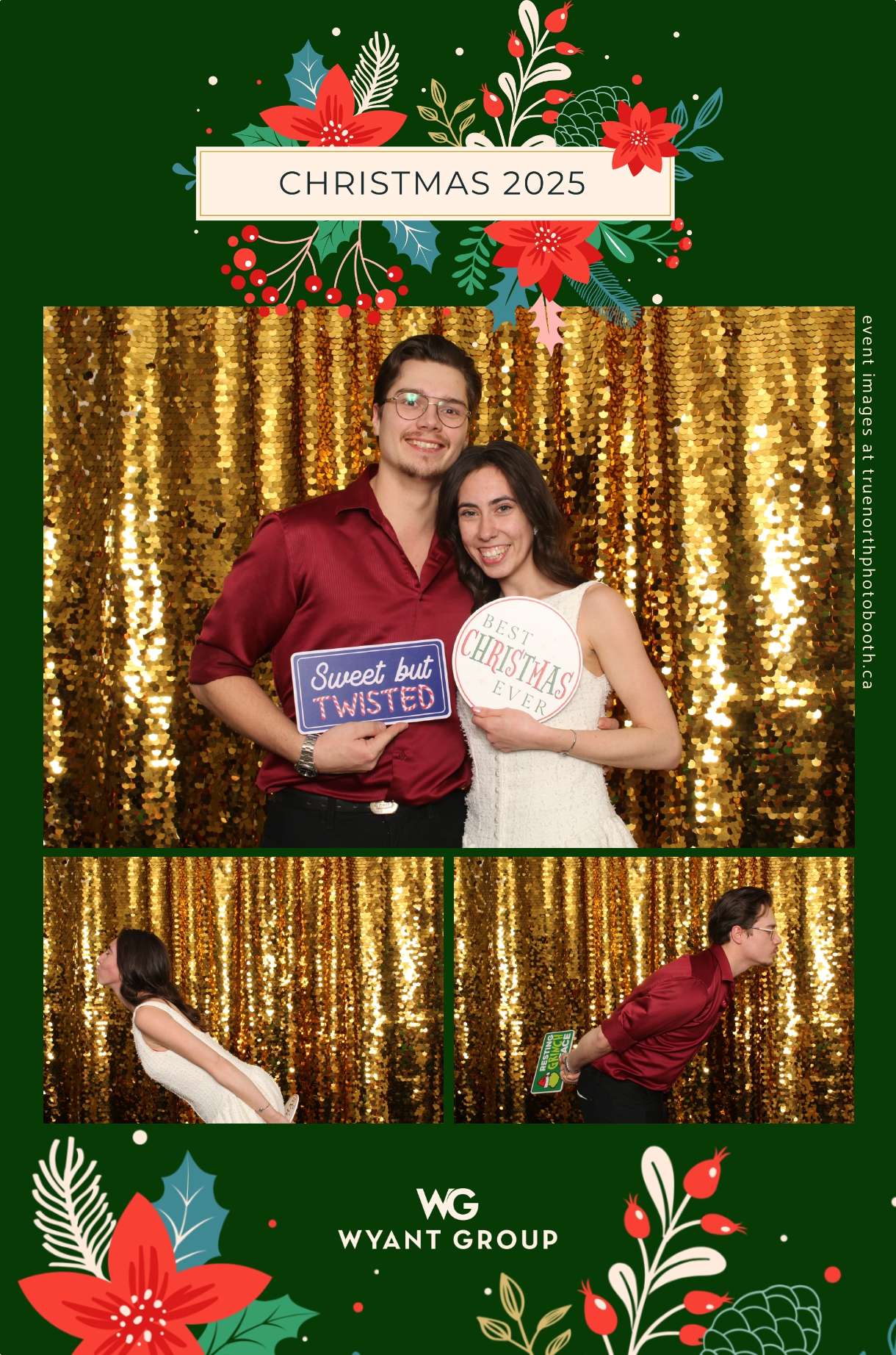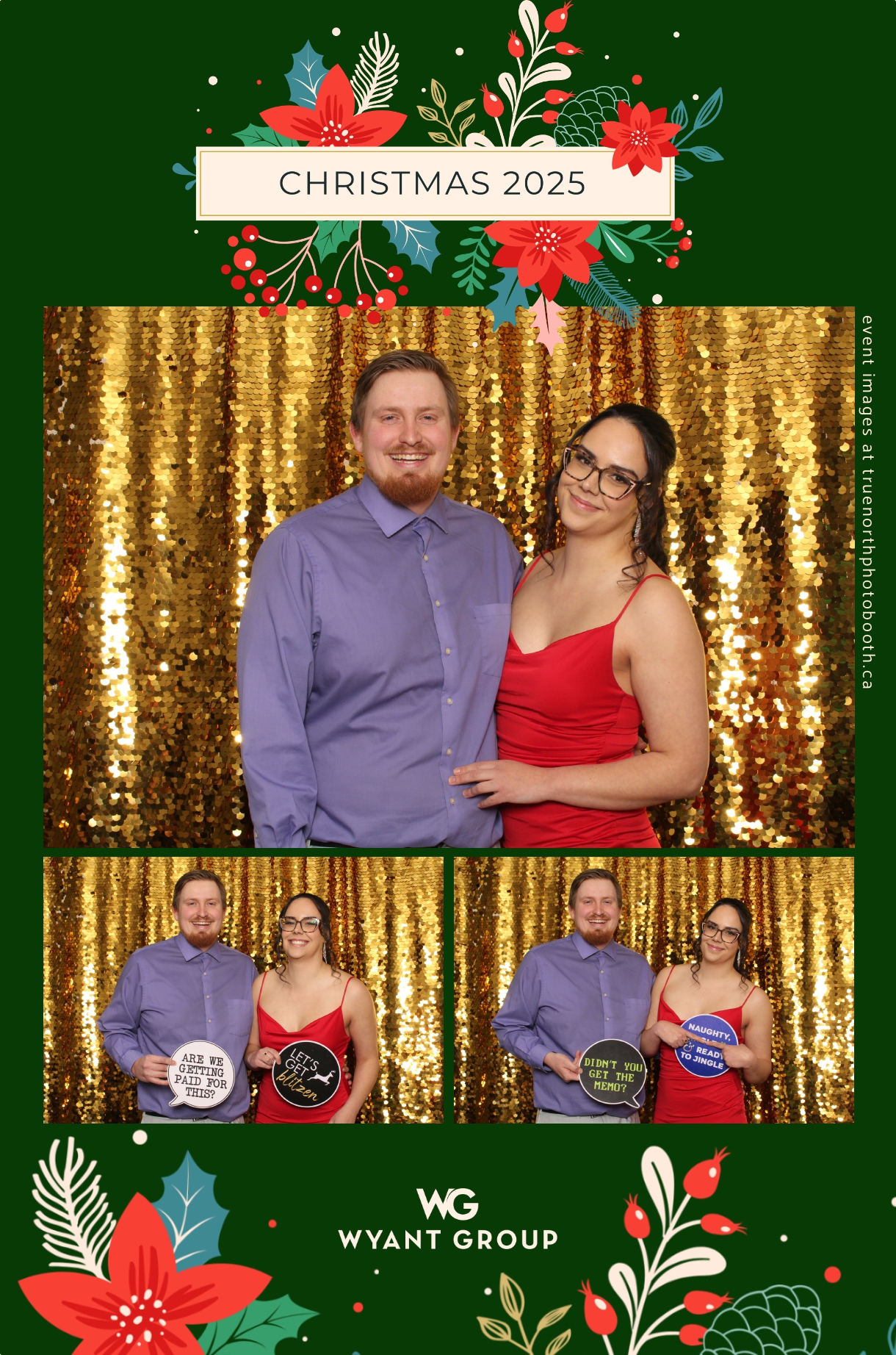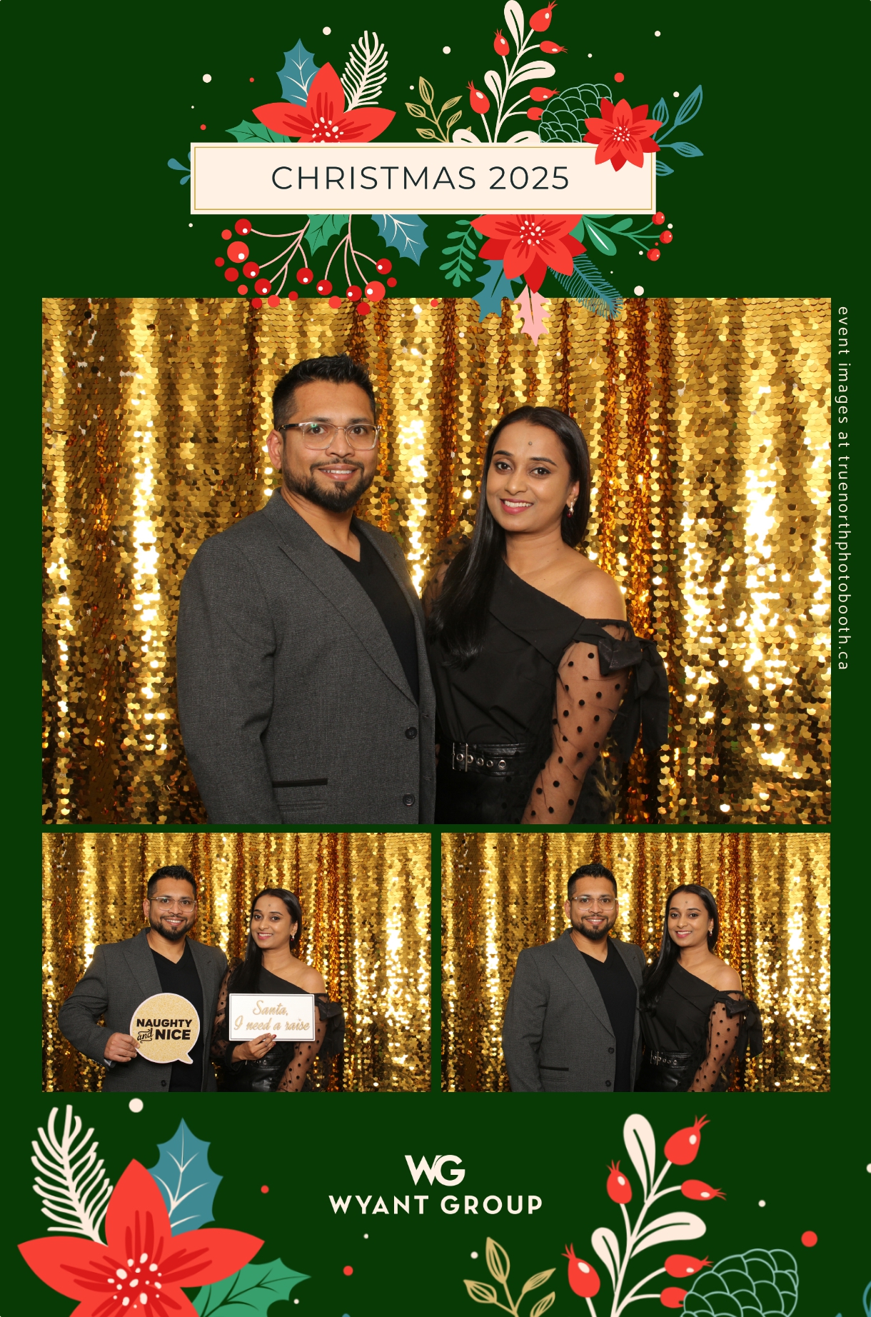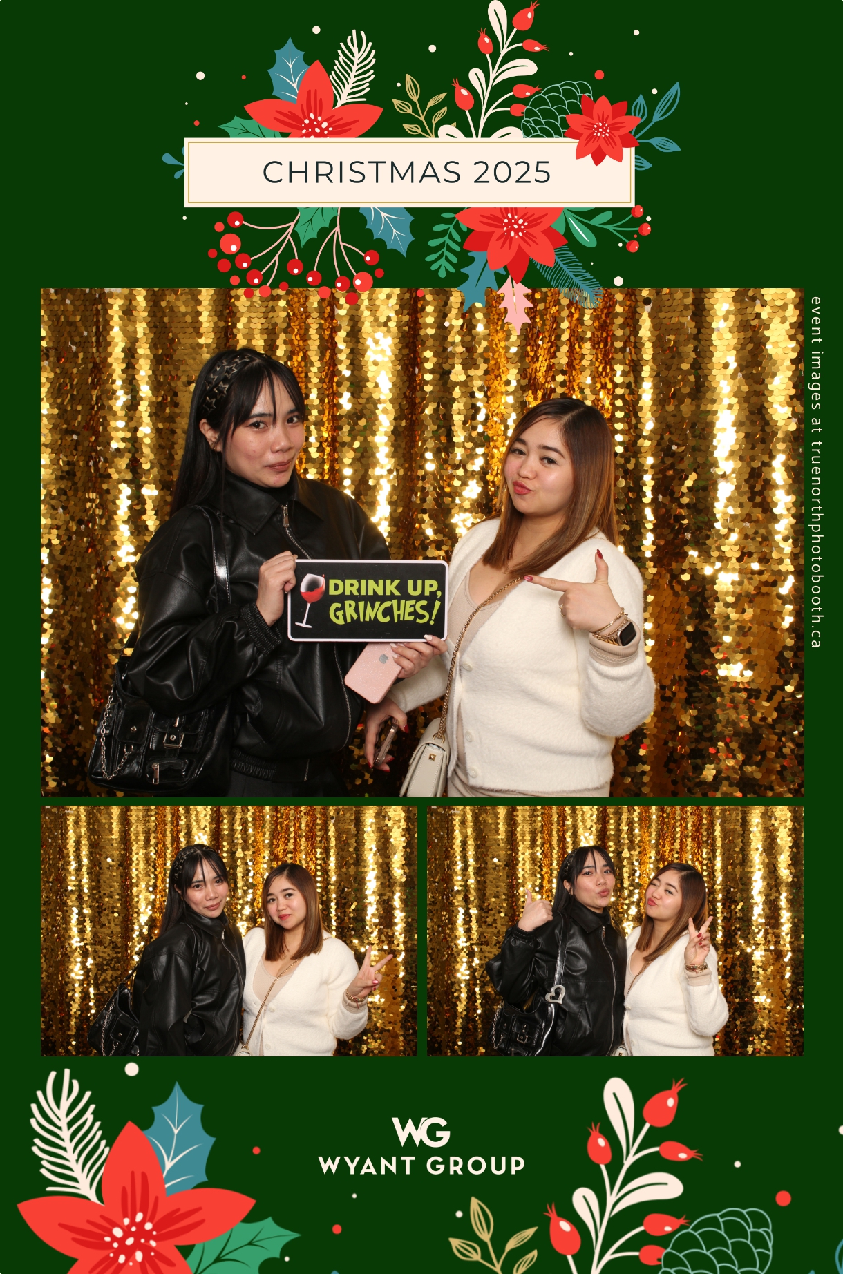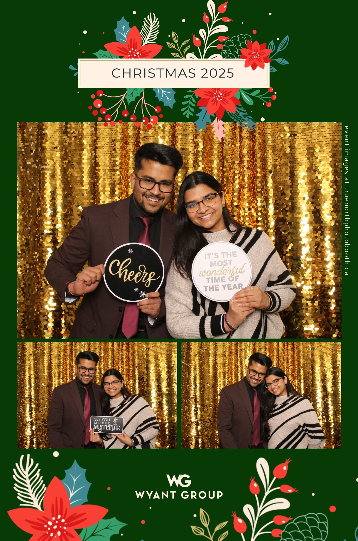 Guests enjoyed capturing memories at the interactive photo booth, featuring elegant 4X6 custom photo strips and a dazzling gold sequin backdrop. The glamorous setup added a celebratory sparkle to the evening, giving attendees memorable keepsakes to take home and cherish long after the holiday festivities ended.