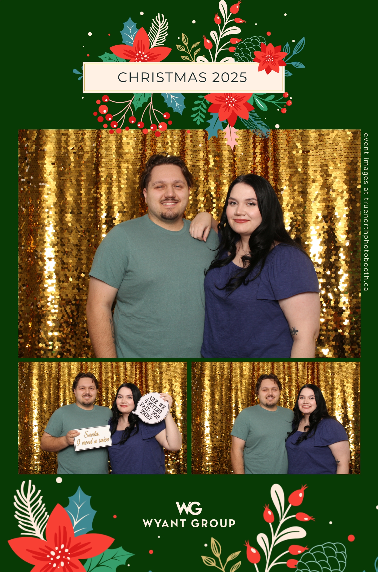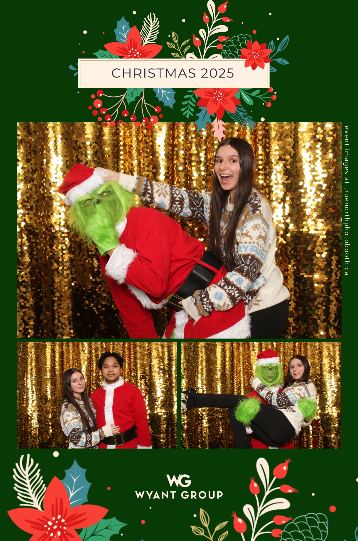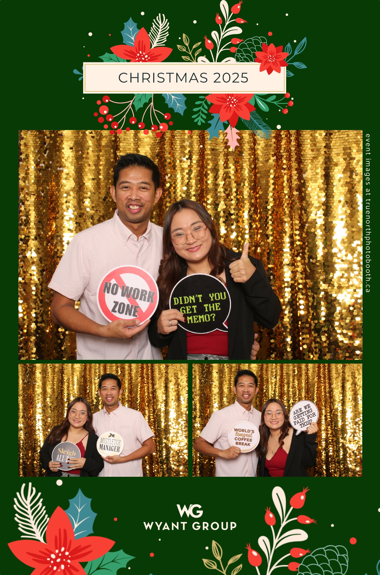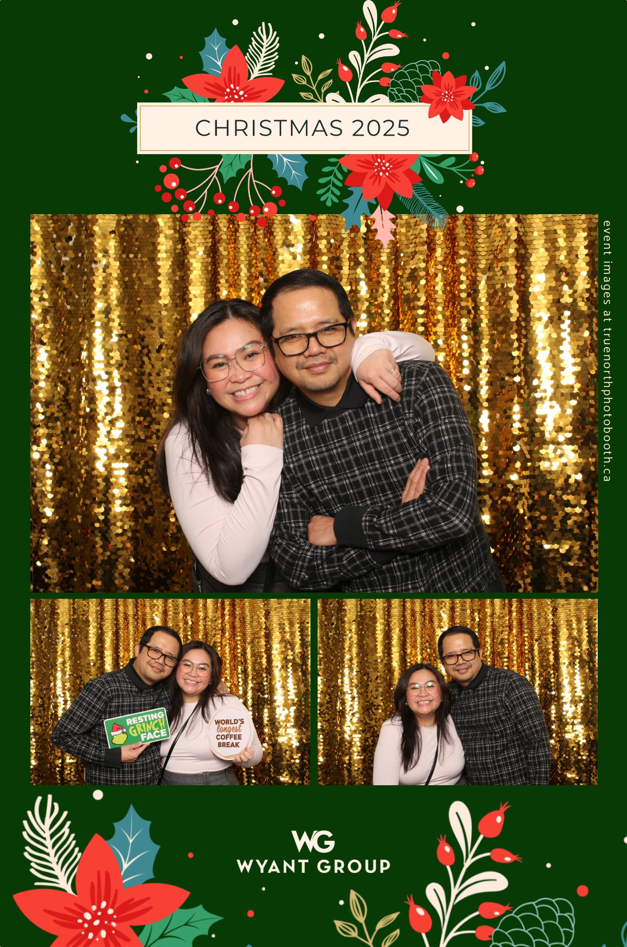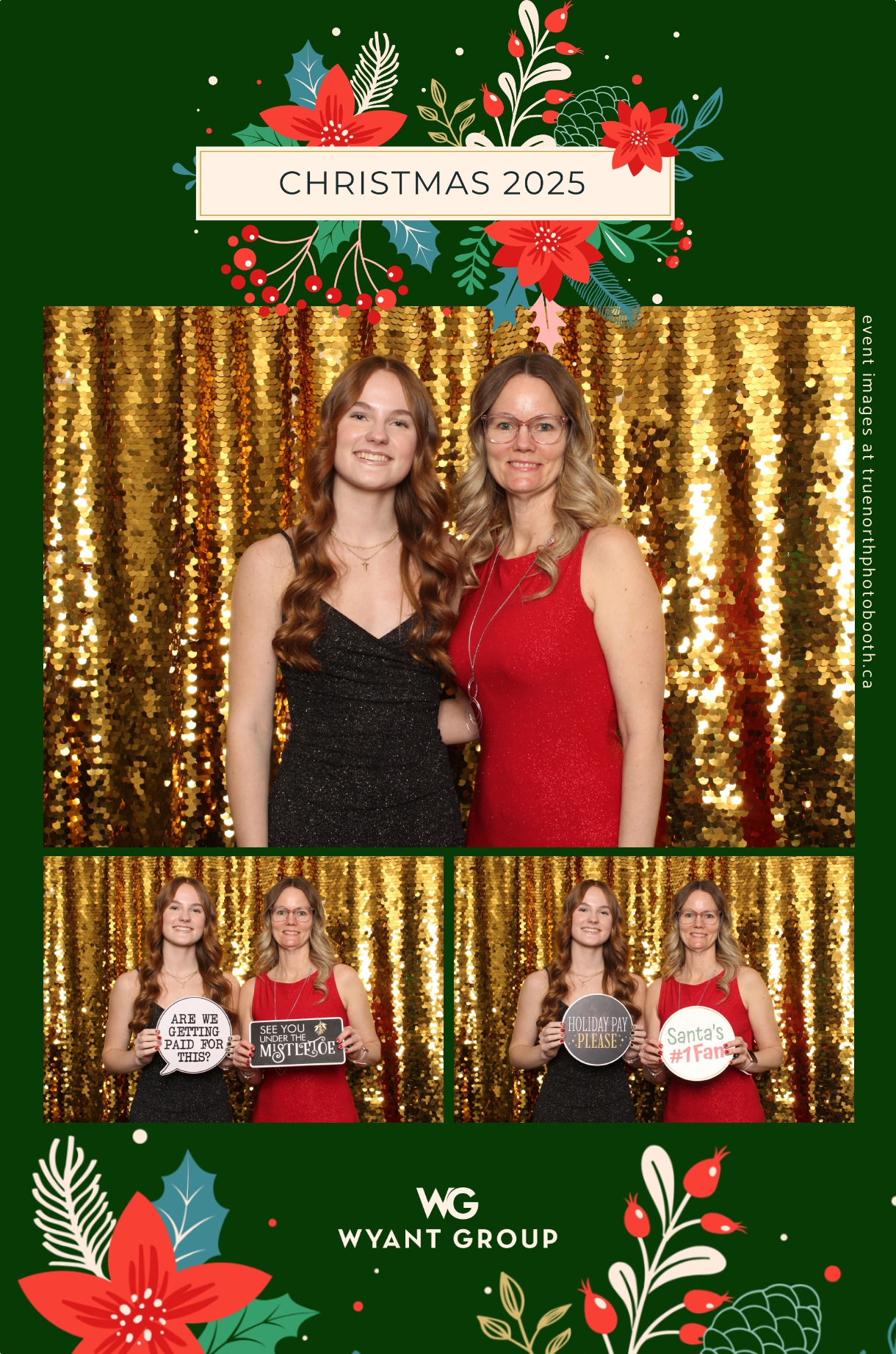 Guests enjoyed capturing memories at the interactive photo booth, featuring elegant 4X6 custom photo strips and a dazzling gold sequin backdrop. The glamorous setup added a celebratory sparkle to the evening, giving attendees memorable keepsakes to take home and cherish long after the holiday festivities ended.